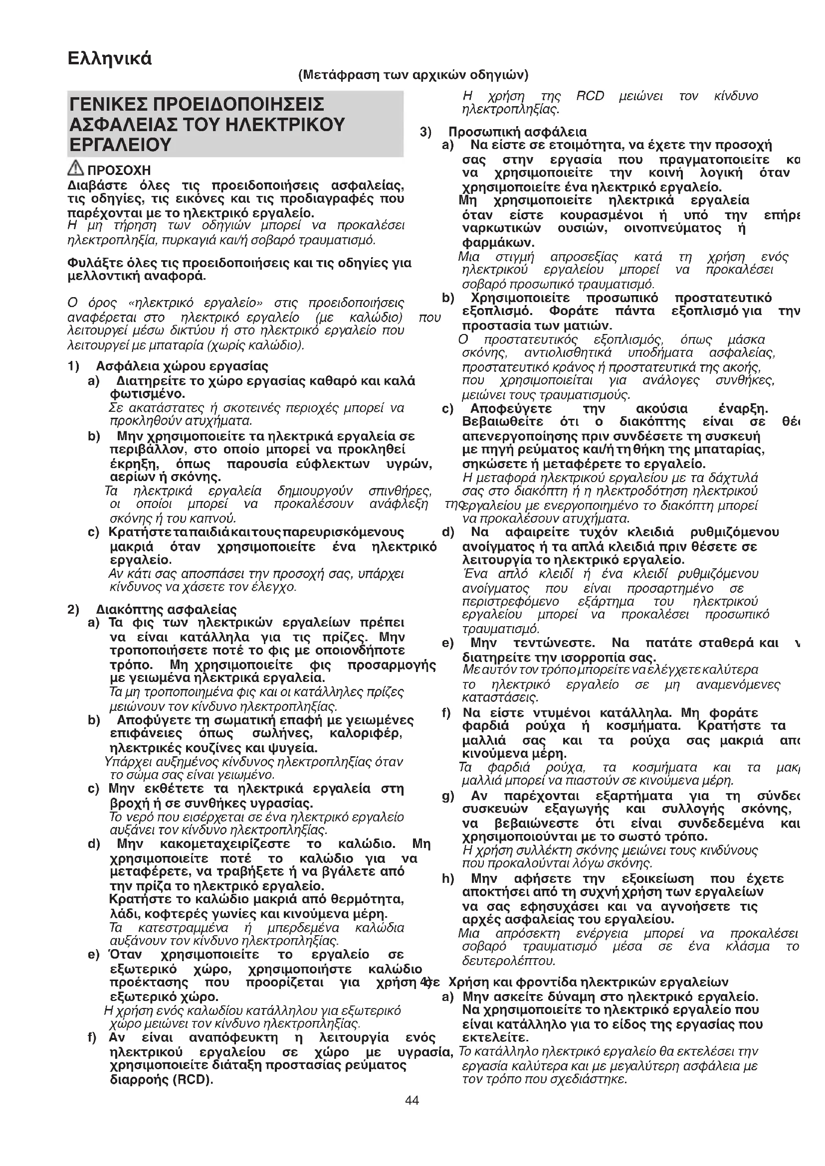 a) Τα φις των ηλεκτρικών εργαλείων πρέπει να είναι κατάλληλα για τις πρίζες. Μην τροποποιήσετεποτέτοφιςμεοποιονδήποτε τρόπο. Μη χρησιμοποιείτε φις προσαρμογής μεγειωμέναηλεκτρικάεργαλεία. Ταμητροποποιημέναφιςκαιοικατάλληλεςπρίζες μειώνουντονκίνδυνοηλεκτροπληξίας. b) Αποφύγετετησωματικήεπαφήμεγειωμένες επιφάνειες όπως σωλήνες, καλοριφέρ, ηλεκτρικέςκουζίνεςκαιψυγεία. Υπάρχειαυξημένοςκίνδυνοςηλεκτροπληξίαςόταν τοσώμασαςείναιγειωμένο. c) Μην εκθέτετε τα ηλεκτρικά εργαλεία στη βροχήήσεσυνθήκεςυγρασίας. Τονερόπουεισέρχεταισεέναηλεκτρικόεργαλείο αυξάνειτονκίνδυνοηλεκτροπληξίας. d) Μην κακομεταχειρίζεστε το καλώδιο. Μη χρησιμοποιείτε ποτέ το καλώδιο για να μεταφέρετε,νατραβήξετεήναβγάλετεαπό τηνπρίζατοηλεκτρικόεργαλείο. Κρατήστετοκαλώδιομακριάαπόθερμότητα, λάδι,κοφτερέςγωνίεςκαικινούμεναμέρη. Τα κατεστραμμένα ή μπερδεμένα καλώδια αυξάνουντονκίνδυνοηλεκτροπληξίας. e) Όταν χρησιμοποιείτε το εργαλείο σε εξωτερικό χώρο, χρησιμοποιήστε καλώδιο προέκτασης που προορίζεται για χρήση σε εξωτερικόχώρο. Ηχρήσηενόςκαλωδίουκατάλληλουγιαεξωτερικό χώρομειώνειτονκίνδυνοηλεκτροπληξίας. f) Αν είναι αναπόφευκτη η λειτουργία ενός ηλεκτρικού εργαλείου σε χώρο με υγρασία, χρησιμοποιείτεδιάταξηπροστασίαςρεύματος διαρροής(RCD). (Μετάφρασητωναρχικώνοδηγιών) 0000Book_WR14VE.indb 44 2019/03/05 16:45:2345