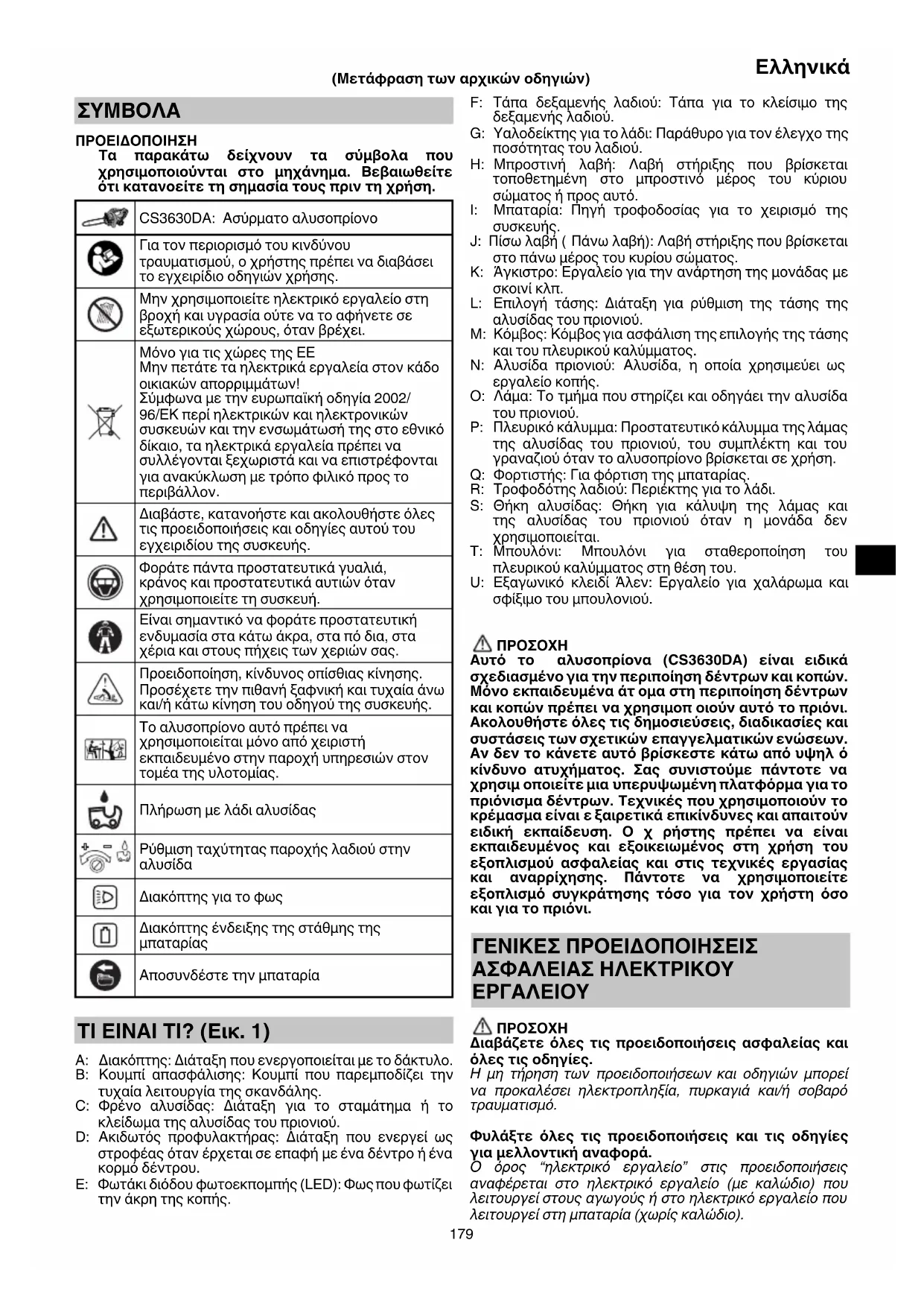 ΠΡΟΕΙΔΟΠΟΙΗΣΗ Τα παρακάτω δείχνουν τα σύμβολα που χρησιμοποιούνται στο μηχάνημα. Βεβαιωθείτε ότι κατανοείτε τη σημασία τους πριν τη χρήση. CS3630DA: Ασύρματο αλυσοπρίονο Για τον περιορισμό του κινδύνου τραυματισμού, ο χρήστης πρέπει να διαβάσει το εγχειρίδιο οδηγιών χρήσης. Μην χρησιμοποιείτε ηλεκτρικό εργαλείο στη βροχή και υγρασία ούτε να το αφήνετε σε εξωτερικούς χώρους, όταν βρέχει. Μόνο για τις χώρες της ΕΕ Μην πετάτε τα ηλεκτρικά εργαλεία στον κάδο οικιακών απορριμμάτων! Σύμφωνα με την ευρωπαϊκή οδηγία 2002/ 96/ΕΚ περί ηλεκτρικών και ηλεκτρονικών συσκευών και την ενσωμάτωσή της στο εθνικό δίκαιο, τα ηλεκτρικά εργαλεία πρέπει να συλλέγονται ξεχωριστά και να επιστρέφονται για ανακύκλωση με τρόπο φιλικό προς το