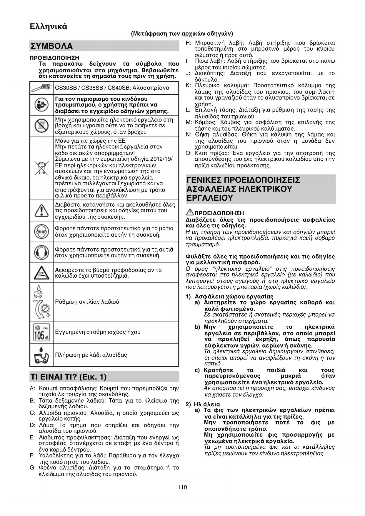 ΠΡΟΕΙΔΟΠΟΙΗΣΗ Τα παρακάτω δείχνουν τα σύμβολα που χρησιμοποιούνται στο μηχάνημα. Βεβαιωθείτε ότι κατανοείτε τη σημασία τους πριν τη χρήση. CS30SB / CS35SB / CS40SB: Αλυσοπρίονο Για τον περιορισμό του κινδύνου τραυματισμού, ο χρήστης πρέπει να διαβάσει το εγχειρίδιο οδηγιών χρήσης. Μην χρησιμοποιείτε ηλεκτρικό εργαλείο στη βροχή και υγρασία ούτε να το αφήνετε σε εξωτερικούς χώρους, όταν βρέχει. Μόνο για τις χώρες της ΕΕ Μην πετάτε τα ηλεκτρικά εργαλεία στον κάδο οικιακών απορριμμάτων! Σύμφωνα με την ευρωπαϊκή οδηγία 2012/19/ EE περί ηλεκτρικών και ηλεκτρονικών συσκευών και την ενσωμάτωσή της στο εθνικό δίκαιο, τα ηλεκτρικά εργαλεία πρέπει να συλλέγονται ξεχωριστά και να επιστρέφονται για ανακύκλωση με τρόπο φιλικό προς το περιβάλλον. Διαβάστε, κατανοήστε και ακολουθήστε όλες τις προειδοποιήσεις και οδηγίες αυτού του εγχειριδίου της συσκευής. Φοράτε πάντοτε προστατευτικά για τα μάτια όταν χρησιμοποιείτε αυτήν τη συσκευή. Φοράτε πάντοτε προστατευτικά για τα αυτιά όταν χρησιμοποιείτε αυτήν τη συσκευή. Αφαιρέστε το βύσμα τροφοδοσίας αν το καλώδιο έχει υποστεί ζημιά. Ρύθμιση αντλίας λαδιού Εγγυημένη στάθμη ισχύος ήχου Πλήρωση με λάδι αλυσίδας TΙ ΕΙΝΑΙ ΤΙ? (Εικ. 1) A: Κουμπί απασφάλισης: Κουμπί που παρεμποδίζει την τυχαία λειτουργία της σκανδάλης. B: Τάπα δεξαμενής λαδιού: Τάπα για το κλείσιμο της δεξαμενής λαδιού. C: Αλυσίδα πριονιού: Αλυσίδα, η οποία χρησιμεύει ως εργαλείο κοπής. D: Λάμα: Το τμήμα που στηρίζει και οδηγάει την αλυσίδα του πριονιού. E: Ακιδωτός προφυλακτήρας: Διάταξη που ενεργεί ως στροφέας όταν έρχεται σε επαφή με ένα δέντρο ή ένα κορμό δέντρου. F: Υαλοδείκτης για το λάδι: Παράθυρο για τον έλεγχο της ποσότητας του λαδιού. G: Φρένο αλυσίδας: Διάταξη για το σταμάτημα ή το κλείδωμα της αλυσίδας του πριονιού. H: Μπροστινή λαβή: Λαβή στήριξης που βρίσκεται τοποθετημένη στο μπροστινό μέρος του κύριου σώματος ή προς αυτό. I: Πίσω λαβή: Λαβή στήριξης που βρίσκεται στο πάνω μέρος του κυρίου σώματος. J: Διακόπτης: Διάταξη που ενεργοποιείται με το