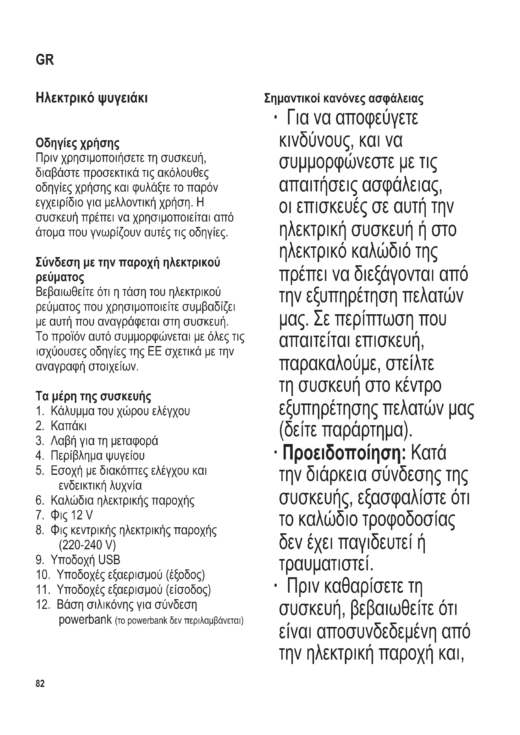 powerbank (το powerbank δεν περιλαμβάνεται) Σημαντικοί κανόνες ασφάλειας ∙ Για να αποφεύγετε κινδύνους, και να συμμορφώνεστε με τις απαιτήσεις ασφάλειας, οι επισκευές σε αυτή την ηλεκτρική συσκευή ή στο ηλεκτρικό καλώδιό της πρέπει να διεξάγονται από την εξυπηρέτηση πελατών μας. Σε περίπτωση που απαιτείται επισκευή, παρακαλούμε, στείλτε τη συσκευή στο κέντρο εξυπηρέτησης πελατών μας (δείτε παράρτημα). ∙ Προειδοποίηση: Κατά την διάρκεια σύνδεσης της συσκευής, εξασφαλίστε ότι το καλώδιο τροφοδοσίας δεν έχει παγιδευτεί ή τραυματιστεί. ∙ Πριν καθαρίσετε τη συσκευή, βεβαιωθείτε ότι είναι αποσυνδεδεμένη από την ηλεκτρική παροχή και, GR104 x 142 mm