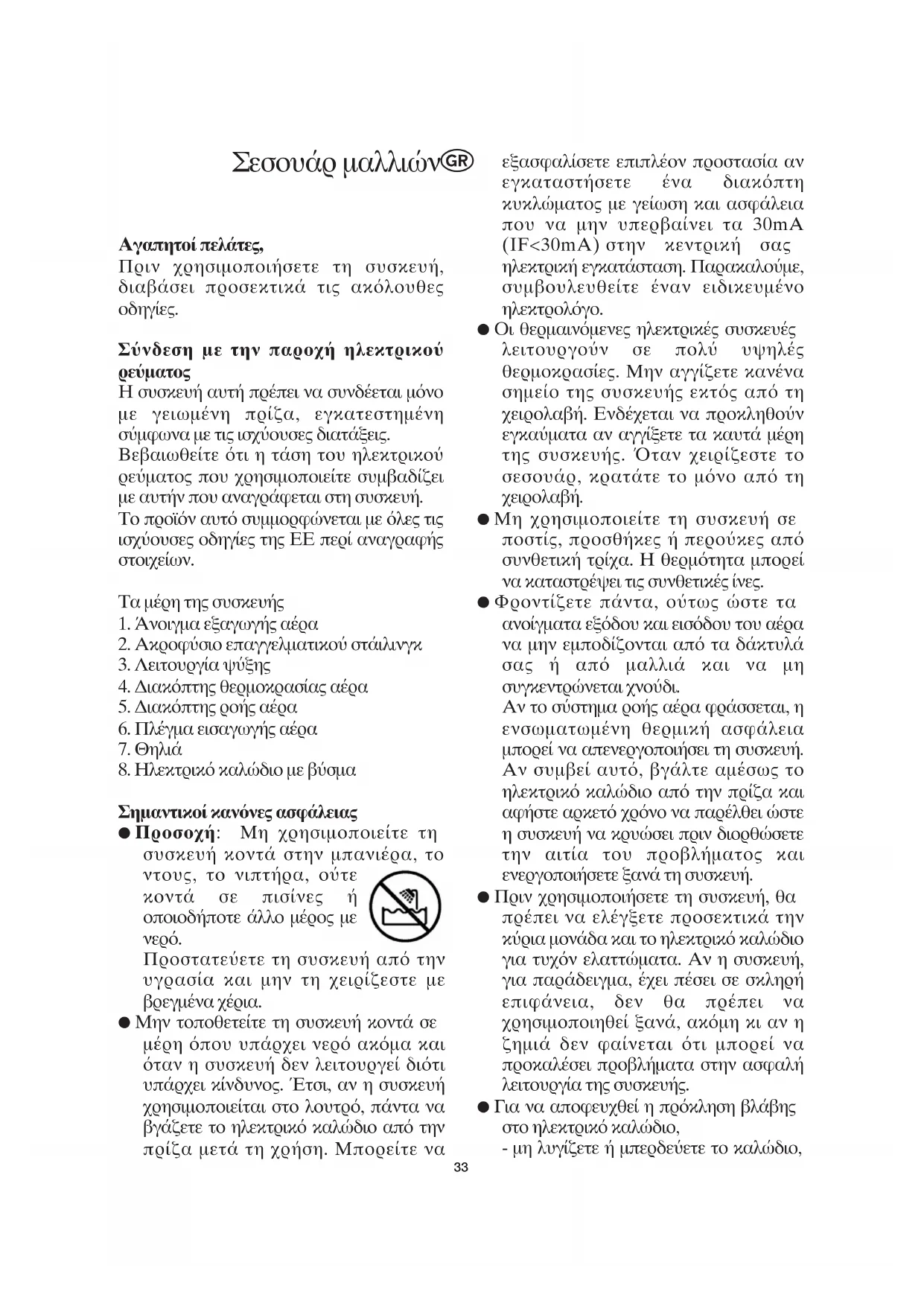 Προστατε"ετε τη συσκευ απ την υγρασα και μην τη χειρζεστε με βρεγμνα χρια. ● Μην τοποθετετε τη συσκευ κοντ σε μρη που υπρχει νερ ακμα και ταν η συσκευ δεν λειτουργε διτι υπρχει κνδυνος. ;τσι, αν η συσκευ χρησιμοποιεται στο λουτρ, πντα να βγζετε το ηλεκτρικ καλδιο απ την πρζα μετ τη χρση. Μπορετε να εξασφαλσετε επιπλον προστασα αν εγκαταστσετε να διακπτη κυκλματος με γεωση και ασφλεια που να μην υπερβανει τα 30mA (IF<30mA) στην κεντρικ σας ηλεκτρικ εγκατσταση. Παρακαλο"με, συμβουλευθετε ναν ειδικευμνο ηλεκτρολγο. ● Οι θερμαινμενες ηλεκτρικς συσκευς λειτουργο"ν σε πολ" υψηλς θερμοκρασες. Μην αγγζετε καννα σημεο της συσκευς εκτς απ τη χειρολαβ. Ενδχεται να προκληθο"ν εγκα"ματα αν αγγξετε τα καυτ μρη της συσκευς. <ταν χειρζεστε το σεσουρ, κραττε το μνο απ τη