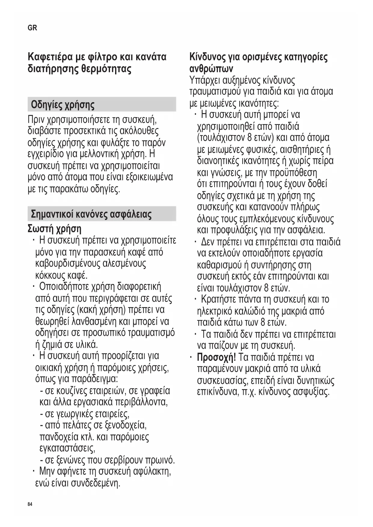 W przypadku pojawienia się problemów, które nie są opisane w tabeli, należy skontaktować się z naszym Działem Obsługi Klienta. Odpowiednie dane kontaktowe znajdują się w załączniku do niniejszej instrukcji.84 142 x 208 mm Καφετιέρα με φίλτρο και κανάτα διατήρησης θερμότητας Οδηγίες χρήσης Πριν χρησιμοποιήσετε τη συσκευή, διαβάστε προσεκτικά τις ακόλουθες οδηγίες χρήσης και φυλάξτε το παρόν εγχειρίδιο για μελλοντική χρήση. Η συσκευή πρέπει να χρησιμοποιείται μόνο από άτομα που είναι εξοικειωμένα με τις παρακάτω οδηγίες. Σημαντικοί κανόνες ασφάλειας Σωστή χρήση ∙ Η συσκευή πρέπει να χρησιμοποιείτε μόνο για την παρασκευή καφέ από καβουρδισμένους αλεσμένους κόκκους καφέ. ∙ Οποιαδήποτε χρήση διαφορετική από αυτή που περιγράφεται σε αυτές τις οδηγίες (κακή χρήση) πρέπει να θεωρηθεί λανθασμένη και μπορεί να οδηγήσει σε προσωπικό τραυματισμό ή ζημιά σε υλικά. ∙ Η συσκευή αυτή προορίζεται για οικιακή χρήση ή παρόμοιες χρήσεις, όπως για παράδειγμα: - σε κουζίνες εταιρειών, σε γραφεία και άλλα εργασιακά περιβάλλοντα, - σε γεωργικές εταιρείες, - από πελάτες σε ξενοδοχεία, πανδοχεία κτλ. και παρόμοιες εγκαταστάσεις, - σε ξενώνες που σερβίρουν πρωινό. ∙ Μην αφήνετε τη συσκευή αφύλακτη, ενώ είναι συνδεδεμένη. Κίνδυνος για ορισμένες κατηγορίες