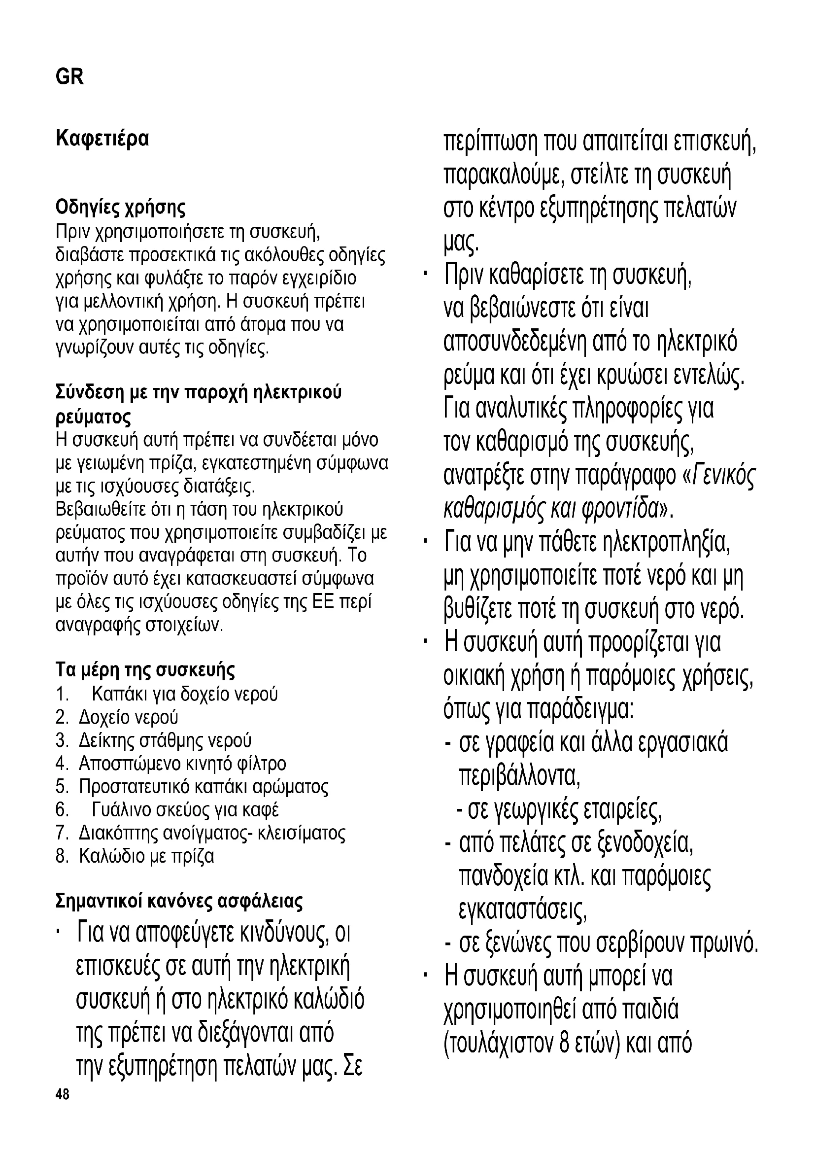 κύκλους φιλτραρίσματος χρησιμοποιώντας την ενδεικτική μέγιστη ποσότητα νερού, αλλά χωρίς να χρησιμοποιήσετε σκόνη καφέ. Επίσης, πρέπει να εκτελεστεί η διαδικασία αυτή σε περίπτωση που η συσκευή δεν έχει χρησιμοποιηθεί για μεγάλη χρονική περίοδο, αλλά και μετά την αφαίρεση συσσωρευμένων αλάτων. Γενικές πληροφορίες ∙ Οι κλίμακες στο δοχείο νερού και το γυάλινο σκεύος για καφέ διευκολύνουν στο γέμισμα του δοχείου με τη σωστή ποσότητα καθαρού νερού. Αν υπάρχει διπλή κλίμακα, η αριστερή χρησιμοποιείται για φλιτζάνια κανονικού μεγέθους των 125ml περίπου, ενώ η δεξιά χρησιμοποιείται για μικρότερα φλιτζάνια. Φροντίστε να μην υπερβείτε την ενδεικτική μέγιστη ποσότητα νερού. ∙ Αν απαιτούνται συνεχόμενοι κύκλοι λειτουργίας, απενεργοποιήστε την καφετιέρα μετά από κάθε κύκλο και αφήστε τη συσκευή να κρυώσει για 5 περίπου λεπτά. ∙ Σημαντική σημείωση: Όταν γεμίζετε τη συσκευή με φρέσκο νερό λίγο μετά την ολοκλήρωση ενός κύκλου λειτουργίας, υπάρχει κίνδυνος πρόκλησης εγκαυμάτων από το καυτό νερό ή τον ατμό που απελευθερώνεται από την έξοδο νερού.