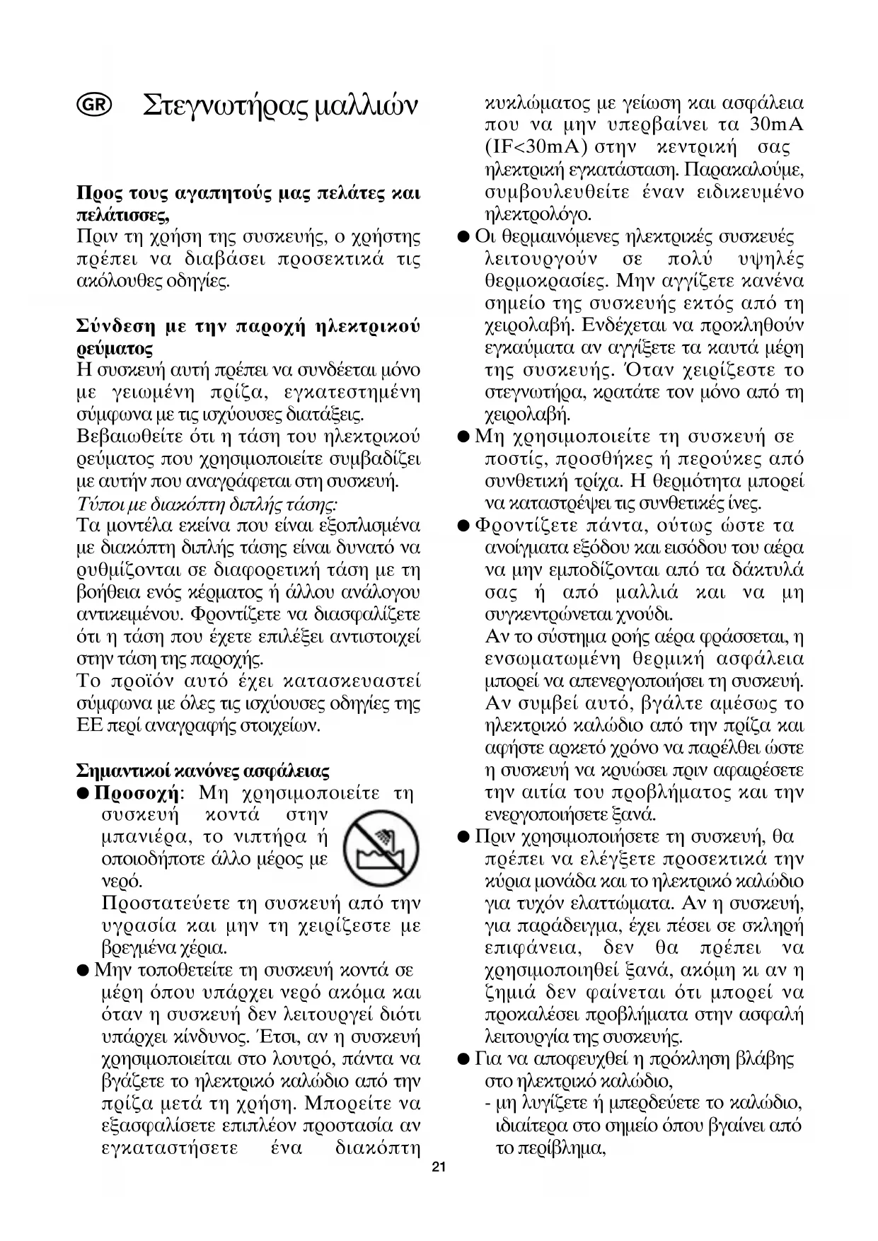 Προστατε"ετε τη συσκευ απ την υγρασα και μην τη χειρζεστε με βρεγμνα χρια. ● Μην τοποθετετε τη συσκευ κοντ σε μρη που υπρχει νερ ακμα και ταν η συσκευ δεν λειτουργε διτι υπρχει κνδυνος. +τσι, αν η συσκευ χρησιμοποιεται στο λουτρ, πντα να βγζετε το ηλεκτρικ καλδιο απ την πρζα μετ τη χρση. Μπορετε να εξασφαλσετε επιπλον προστασα αν εγκαταστσετε να διακπτη κυκλματος με γεωση και ασφλεια που να μην υπερβανει τα 30mA (IF<30mA) στην κεντρικ σας ηλεκτρικ εγκατσταση. Παρακαλο"με, συμβουλευθετε ναν ειδικευμνο ηλεκτρολγο. ● Οι θερμαινμενες ηλεκτρικς συσκευς λειτουργο"ν σε πολ" υψηλς θερμοκρασες. Μην αγγζετε καννα σημεο της συσκευς εκτς απ τη χειρολαβ. Ενδχεται να προκληθο"ν εγκα"ματα αν αγγξετε τα καυτ μρη της συσκευς. /ταν χειρζεστε το στεγνωτρα, κραττε τον μνο απ τη