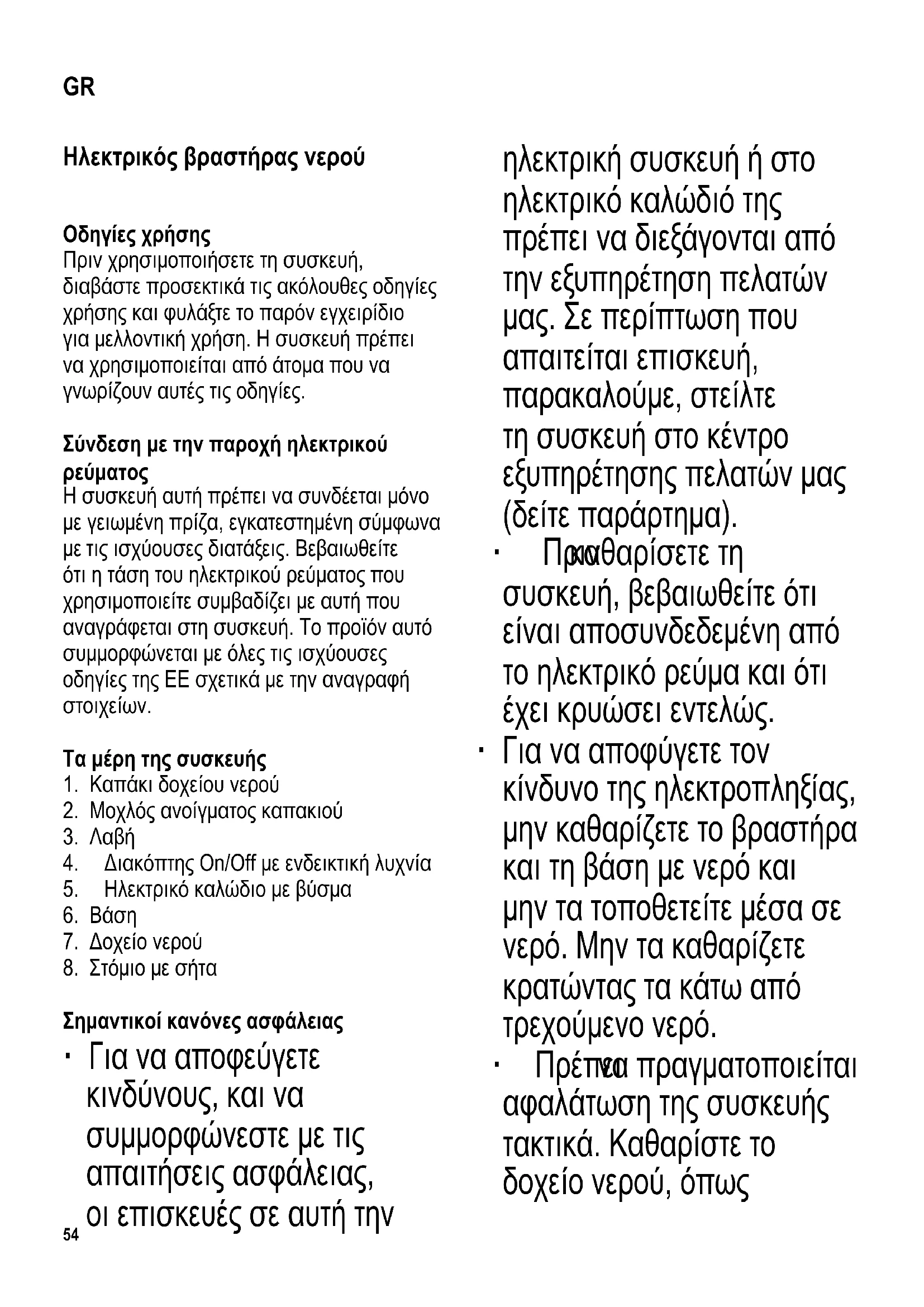 χρησιμοποιείται μόνο με τη βάση που τον συνοδεύει. ∙ Μη βγάζετε ποτέ το δοχείο νερού από τη βάση (και μην το αντικαθιστάτε) όσο είναι αναμμένη η συσκευή. ∙ Οι ηλεκτρικές συνδέσεις στη βάση πρέπει πάντα να προστατεύονται από την πιθανή επαφή με το νερό. ∙ Προσοχή! Η κακή χρήση μπορεί να προκαλέσει σοβαρό προσωπικό τραυματισμό. ∙ Προσοχή! Τα παιδιά πρέπει να παραμένουν μακριά από τα υλικά συσκευασίας επειδή είναι επικίνδυνα, π.χ. κίνδυνος ασφυξίας. ∙ Κάθε φορά που χρησιμοποιείτε τη συσκευή, θα πρέπει να ελέγχετε προσεκτικά την κύρια μονάδα, το ηλεκτρικό καλώδιο, καθώς και κάθε εξάρτημα για τυχόν ελαττώματα. Αν η συσκευή, για παράδειγμα, έχει πέσει σε σκληρή επιφάνεια ή έχει ασκηθεί υπερβολική δύναμη για το τράβηγμα του ηλεκτρικού καλωδίου δεν θα πρέπει να χρησιμοποιηθεί ξανά, ακόμη κι αν η ζημιά δεν φαίνεται ότι μπορεί να προκαλέσει προβλήματα στην ασφαλή λειτουργία της συσκευής. ∙ Η συσκευή θα πρέπει να χρησιμοποιείται μόνο σε μια επίπεδη επιφάνεια που57 αντέχει στη θερμότητα. ∙ Μη θέτετε τη συσκευή σε λειτουργία κάτω από κρεμαστό ντουλάπι ή παρόμοιο αντικείμενο. Υπάρχει κίνδυνος ο ατμός που απελευθερώνεται να παγιδευτεί κάτω από τέτοια αντικείμενα. ∙ Φροντίζετε η συσκευή και το ηλεκτρικό καλώδιό της να μην έρχονται σε επαφή με γυμνή φλόγα ή οποιαδήποτε καυτή επιφάνεια, όπως ηλεκτρικές εστίες. ∙ Μην αφήνετε το ηλεκτρικό καλώδιο να κρέμεται ελεύθερο και φροντίζετε να μη βρίσκεται κοντά σε καυτά σημεία του περιβλήματος. ∙ Φροντίζετε πάντοτε να βγάζετε το φις του ηλεκτρικού καλωδίου από την πρίζα - σε περίπτωση δυσλειτουργίας, - μετά τη χρήση, - κατά τον καθαρισμό. ∙ Δεν φέρουμε καμία ευθύνη για ζημιές που προκαλούνται λόγω εσφαλμένης χρήσης ή επειδή δεν έχουν τηρηθεί οι παρούσες