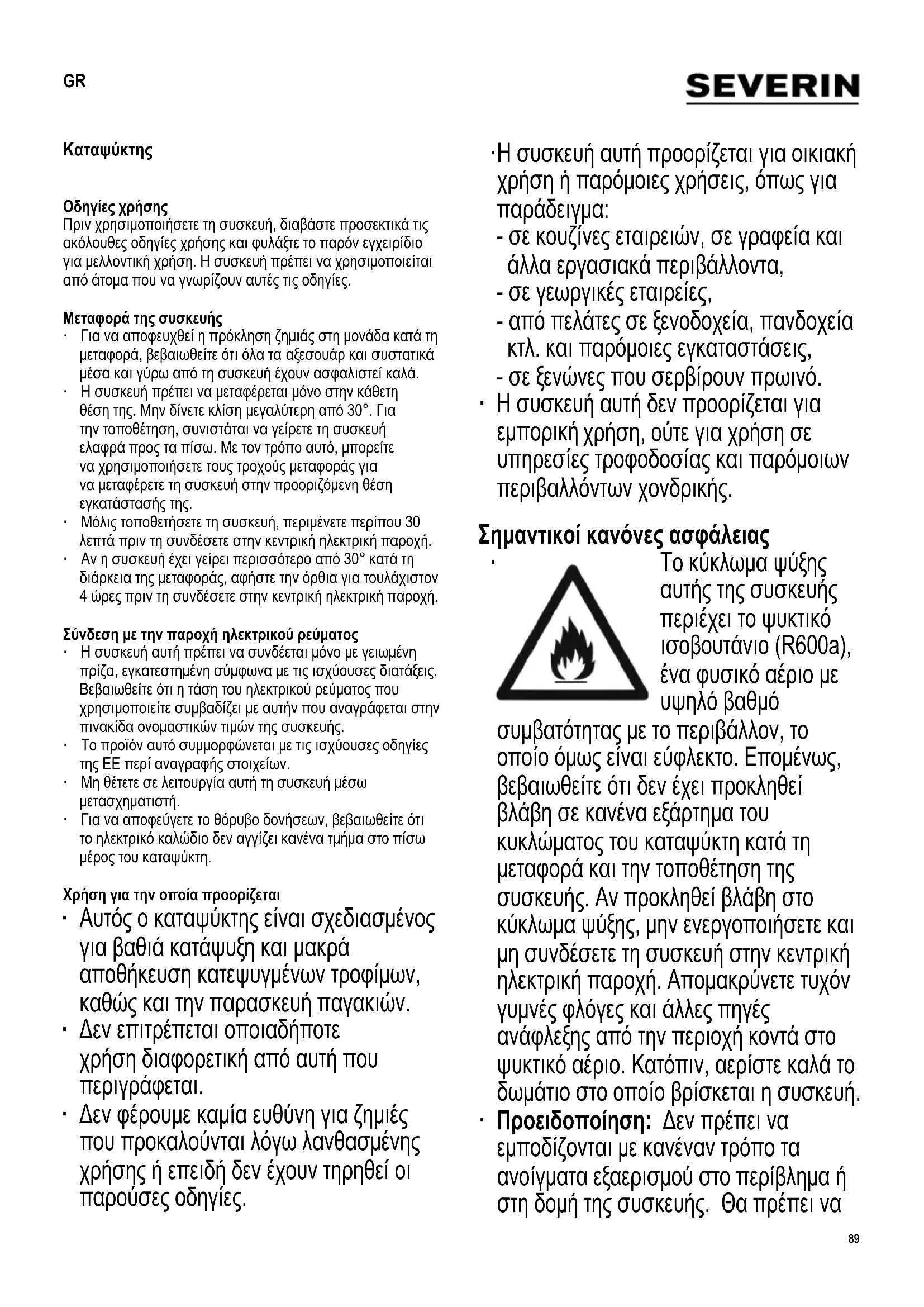 Το κύκλωμα ψύξης αυτής της συσκευής περιέχει το ψυκτικό ισοβουτάνιο (R600a), ένα φυσικό αέριο με υψηλό βαθμό συμβατότητας με το περιβάλλον, το οποίο όμως είναι εύφλεκτο. Επομένως, βεβαιωθείτε ότι δεν έχει προκληθεί βλάβη σε κανένα εξάρτημα του κυκλώματος του καταψύκτη κατά τη μεταφορά και την τοποθέτηση της συσκευής. Αν προκληθεί βλάβη στο κύκλωμα ψύξης, μην ενεργοποιήσετε και μη συνδέσετε τη συσκευή στην κεντρική ηλεκτρική παροχή. Απομακρύνετε τυχόν γυμνές φλόγες και άλλες πηγές ανάφλεξης από την περιοχή κοντά στο ψυκτικό αέριο. Κατόπιν, αερίστε καλά το δωμάτιο στο οποίο βρίσκεται η συσκευή. ∙ Προειδοποίηση: Δεν πρέπει να εμποδίζονται με κανέναν τρόπο τα ανοίγματα εξαερισμού στο περίβλημα ή στη δομή της συσκευής. Θα πρέπει να GR90 εξασφαλίζετε πάντα επαρκή εξαερισμό. ∙ Προειδοποίηση: Μην προκαλείτε βλάβη στο κύκλωμα ψύξης. Τυχόν διαρροή ψυκτικού μπορεί να προκαλέσει βλάβη στα μάτια. Επίσης, υπάρχει και ο κίνδυνος ανάφλεξης του αερίου. ∙ Προειδοποίηση: Μη χρησιμοποιείτε καμία εξωτερική συσκευή (π.χ. καλοριφέρ ή αερόθερμα) για να επιταχύνετε την απόψυξη. Ακολουθήστε μόνο τις μεθόδους που συνιστώνται στο παρόν εγχειρίδιο. ∙ Προειδοποίηση: Μη θέτετε σε λειτουργία καμιά άλλη ηλεκτρική συσκευή (π.χ. συσκευές παραγωγής παγακιών) μέσα στον καταψύκτη εκτός εάν εγκρίνεται ειδικά σε αυτό το εγχειρίδιο. ∙ Πριν συνδέσετε τη συσκευή στην κεντρική ηλεκτρική παροχή, πρέπει να ελέγξετε προσεκτικά αυτήν και το ηλεκτρικό καλώδιό της για τυχόν βλάβη που προκλήθηκε κατά τη μεταφορά. Σε περίπτωση που εντοπιστεί βλάβη, η συσκευή δεν θα πρέπει να συνδεθεί στην κεντρική ηλεκτρική παροχή. ∙ Η συσκευή αυτή δεν είναι σχεδιασμένη για την αποθήκευση εκρηκτικών υλικών, όπως περιέκτες αερολυμάτων με εύφλεκτη προωθητική ουσία. ∙ Αν πωλήσετε, παραδώσετε σε τρίτο
