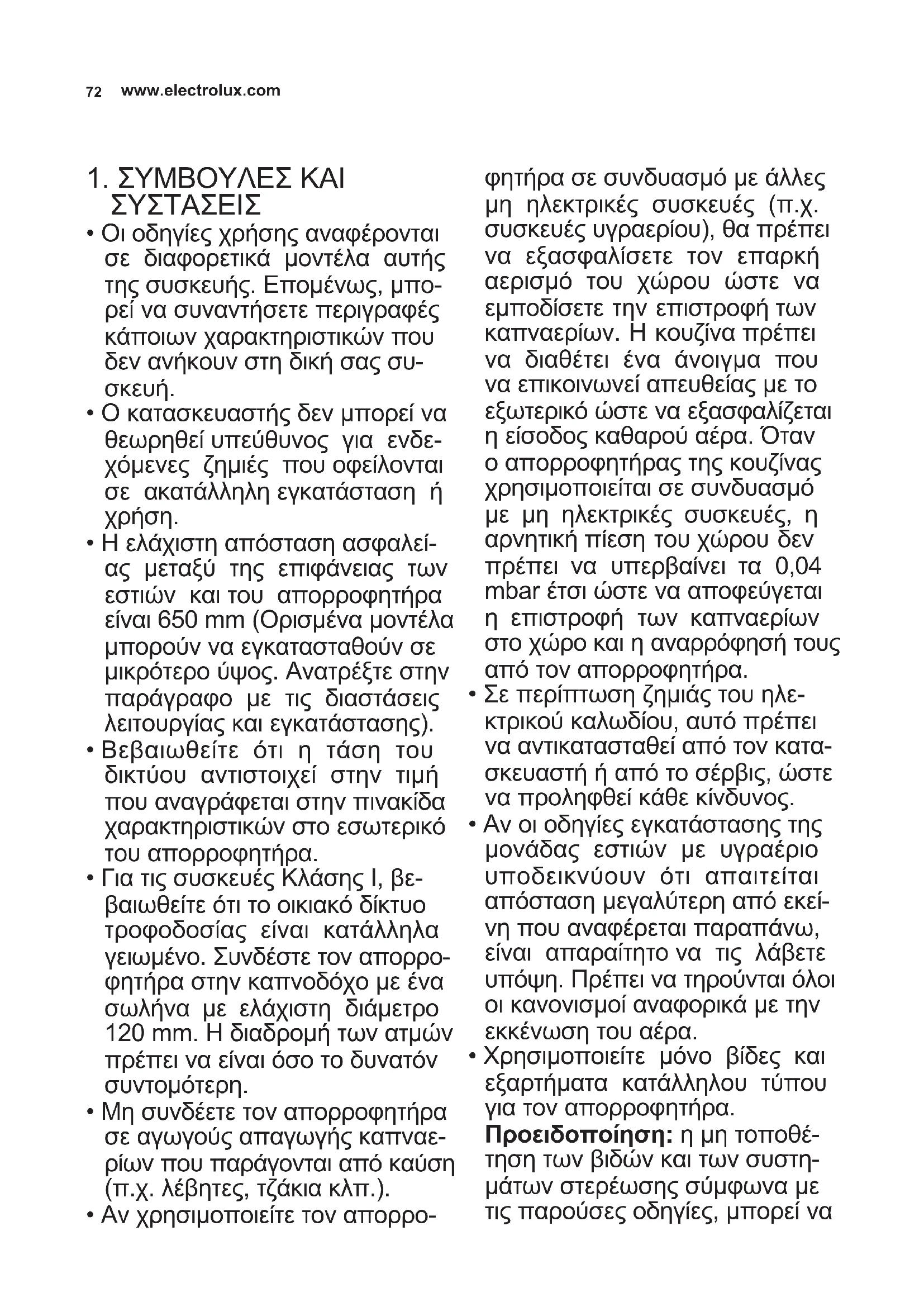 - Για τις συσκευές Κλάσης Ί, βε- βαιωθείτε ότι το οικιακό δίκτυο τροφοδοσίας είναι κατάλληλα γειωμένο. Συνδέστε τον απορρο- φητήρα στην καπνοδόχο με ένα σωλήνα με ελάχιστη διάμετρο 120 mm. Η διαδρομή των ατμών πρέπει να είναι όσο το δυνατόν συντομότερη.