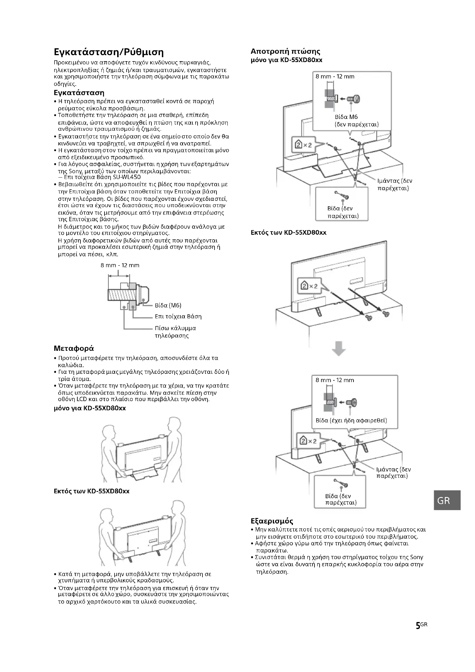 - Όταν μεταφέρετε την τηλεόραση για επισκευή ή όταν την μεταφέρετε σε άλλο χώρο, συσκευάστε την χρησιμοποιώντας το αρχικό χαρτόκουτο και τα υλικά συσκευασίας. Αποτροπή πτώσης μόνο για KD-55XD80xx Εκτός των KD-55XD80xx