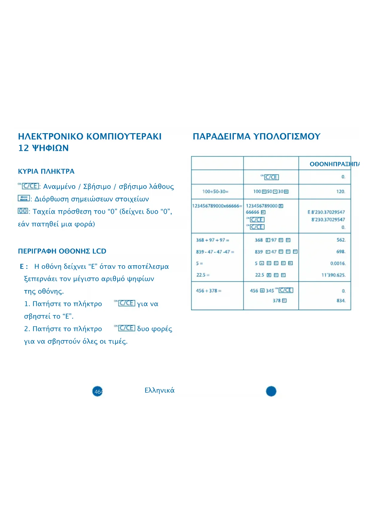 ДЕЙСТВИЕПРИМЕР46 47 ΗΛΕΚΤΡΟΝΙΚΟ ΚΟΜΠΙΟΥΤΕΡΑΚΙ 12 ΨΗΦΙΩΝ ΚΥΡΙΑ ΠΛΗΚΤΡΑ : Αναμμένο / Σβήσιμο / σβήσιμο λάθους : Διόρθωση σημειώσεων στοιχείων : Ταχεία πρόσθεση του “0” (δείχνει δυο “0”, εάν πατηθεί μια φορά) ΠΕΡΙΓΡΑΦΗ ΟΘΟΝΗΣ LCD E : Η οθόνη δείχνει “E” όταν το αποτέλεσμα ξεπερνάει τον μέγιστο αριθμό ψηφίων της οθόνης.