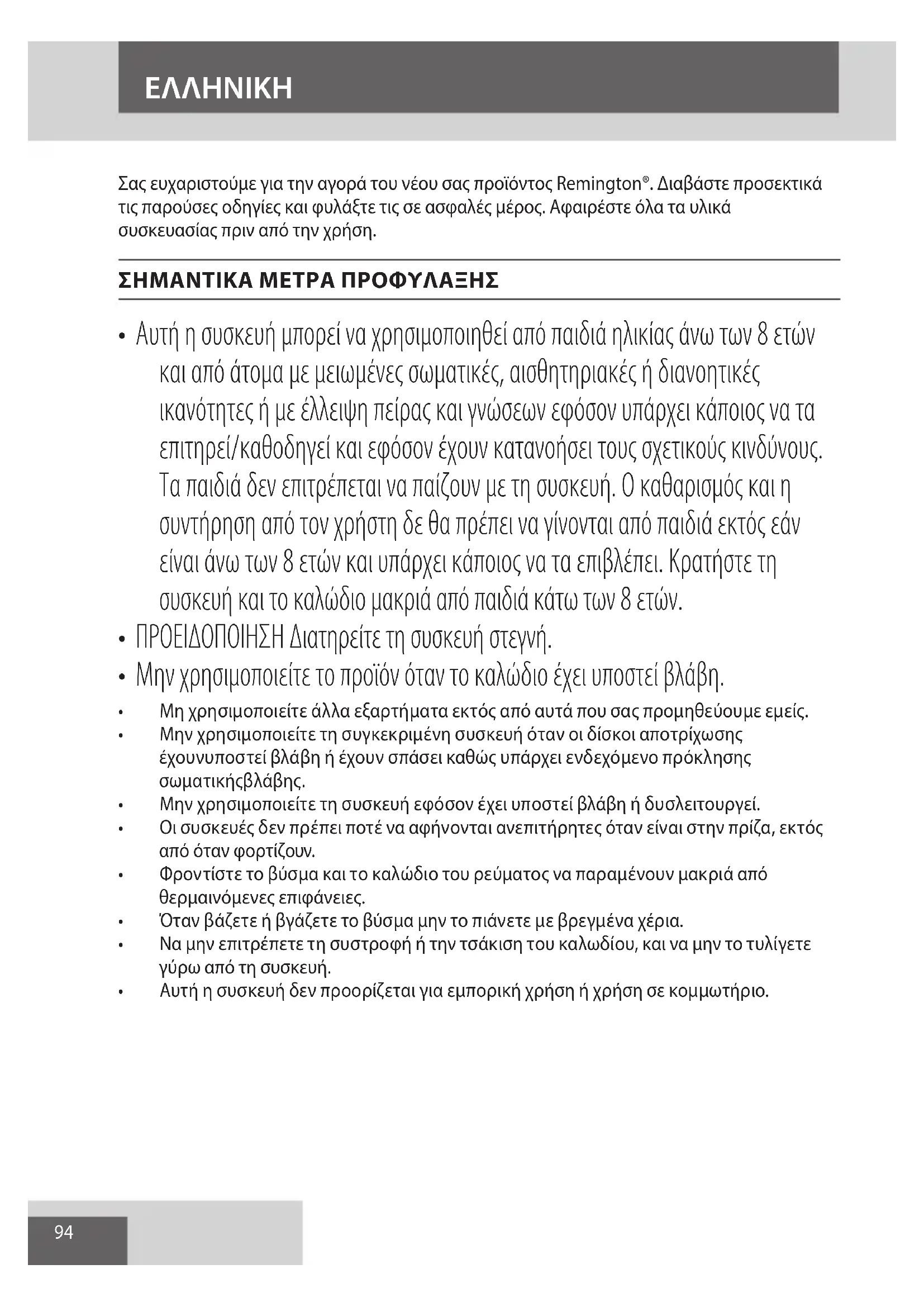 Για την αποφυγή προβλημάτων στο περιβάλλον και την υγεία λόγω επιβλαβών ουσιών, οι συσκευές και οι επαναφορτιζόμενες και μη επαναφορτιζόμενες μπαταρίες που επισημαίνονται με κάποιο από αυτά τα σύμβολα, δεν πρέπει να απορρίπτονται με τα κοινά οικιακά απορρίμματα. Να απορρίπτετε πάντα τις ηλεκτρικές και ηλεκτρονικές συσκευές και, όπου χρειάζεται, τις επαναφορτιζόμενες και μη επαναφορτιζόμενες μπαταρίες, σε κατάλληλο, επίσημο σημείο συλλογής/ανακύκλωσης.100 SLOVENŠČINA Zahvaljujemo se vam za nakup novega izdelka Remington®. Prosimo, da skrbno preberete ta navodila in jih varno shranite. Pred uporabo odstranite vso embalažo.