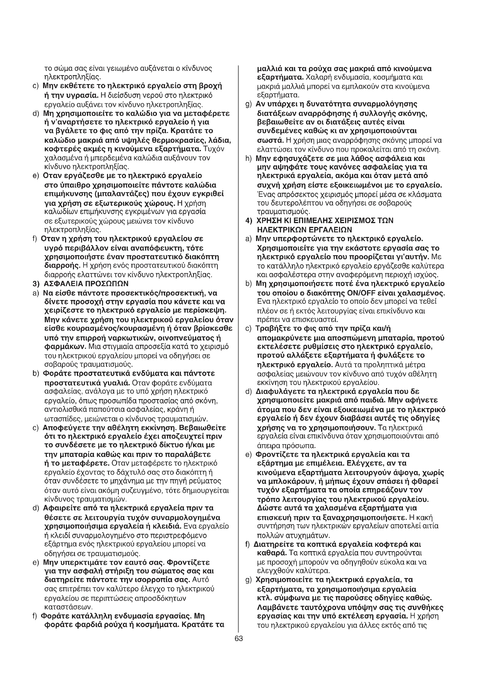 a) Μην υπερφορτώνετε το ηλεκτρικό εργαλείο. Xρησιμοποιείτε για την εκάστοτε εργασία σας το ηλεκτρικό εργαλείο που προορίζεται γι’αυτήν. Με το κατάλληλο ηλεκτρικό εργαλείο εργάζεσθε καλύτερα και ασφαλέστερα στην αναφερόμενη περιοχή ισχύος. b) Μη χρησιμοποιήσετε ποτέ ένα ηλεκτρικό εργαλείο του οποίου ο διακόπτης ON/OFF είναι χαλασμένος. Eνα ηλεκτρικό εργαλείο το οποίο δεν μπορεί να τεθεί πλέον σε ή εκτός λειτουργίας είναι επικίνδυνο και πρέπει να επισκευαστεί. c) Τραβήξτε το φις από την πρίζα και/ή απομακρύνετε μια αποσπώμενη μπαταρία, προτού εκτελέσετε ρυθμίσεις στο ηλεκτρικό εργαλείο, προτού αλλάξετε εξαρτήματα ή φυλάξετε το ηλεκτρικό εργαλείο. Αυτά τα προληπτικά μέτρα ασφαλείας μειώνουν τον κίνδυνο από τυχόν αθέλητη εκκίνηση του ηλεκτρικού εργαλείου. d) Διαφυλάγετε τα ηλεκτρικά εργαλεία που δε χρησιμοποιείτε μακριά από παιδιά. Μην αφήνετε άτομα που δεν είναι εξοικειωμένα με το ηλεκτρικό εργαλείο ή δεν έχουν διαβάσει αυτές τις οδηγίες χρήσης να το χρησιμοποιήσουν. Τα ηλεκτρικά εργαλεία είναι επικίνδυνα όταν χρησιμοποιούνται από άπειρα πρόσωπα. e) Φροντίζετε τα ηλεκτρικά εργαλεία και τα εξάρτημα με επιμέλεια. Ελέγχετε, αν τα κινούμενα εξαρτήματα λειτουργούν άψογα, χωρίς να μπλοκάρουν, ή μήπως έχουν σπάσει ή φθαρεί τυχόν εξαρτήματα τα οποία επηρεάζουν τον τρόπο λειτουργίας του ηλεκτρικού εργαλείου. Δώστε αυτά τα χαλασμένα εξαρτήματα για επισκευή πριν τα ξαναχρησιμοποιήσετε. Η κακή συντήρηση των ηλεκτρικών εργαλείων αποτελεί αιτία πολλών ατυχημάτων. f) Διατηρείτε τα κοπτικά εργαλεία κοφτερά και καθαρά. Τα κοπτικά εργαλεία που συντηρούνται με προσοχή μπορούν να οδηγηθούν εύκολα και να ελεγχθούν καλύτερα. g) Xρησιμοποιείτε τα ηλεκτρικά εργαλεία, τα εξαρτήματα, τα χρησιμοποιήσιμα εργαλεία κτλ. σύμφωνα με τις παρούσες οδηγίες καθώς. Λαμβάνετε ταυτόχρονα υπόψην σας τις συνθήκες εργασίας και την υπό εκτέλεση εργασία. Η χρήση του ηλεκτρικού εργαλείου για άλλες εκτός από τις το σώμα σας είναι γειωμένο αυξάνεται ο κίνδυνος ηλεκτροπληξίας. c) Μην εκθέτετε το ηλεκτρικό εργαλείο στη βροχή ή την υγρασία. Η διείσδυση νερού στο ηλεκτρικό εργαλείο αυξάνει τον κίνδυνο ηλκετροπληξίας. d) Μη χρησιμοποιείτε το καλώδιο για να μεταφέρετε ή ν’αναρτήσετε το ηλεκτρικό εργαλείο ή για να βγάλετε το φις από την πρίζα. Κρατάτε το καλώδιο μακριά από υψηλές θερμοκρασίες, λάδια, κοφτερές ακμές η κινούμενα εξαρτήματα. Τυχόν χαλασμένα ή μπερδεμένα καλώδια αυξάνουν τον κίνδυνο ηλεκτροπληξίας. e) Οταν εργάζεσθε με το ηλεκτρικό εργαλείο στο ύπαιθρο χρησιμοποιείτε πάντοτε καλώδια επιμήκυνσης (μπαλαντάζες) που έχουν εγκριθεί για χρήση σε εξωτερικούς χώρους. Η χρήση καλωδίων επιμήκυνσης εγκριμένων για εργασία σε εξωτερικούς χώρους μειώνει τον κίνδυνο ηλεκτροπληξίας. f) Οταν η χρήση του ηλεκτρικού εργαλείου σε υγρό περιβάλλον είναι αναπόφευκτη, τότε χρησιμοποιήστε έναν προστατευτικό διακόπτη διαρροής. Η χρήση ενός προστατευτικού διακόπτη διαρροής ελαττώνει τον κίνδυνο ηλεκτροπληξίας.