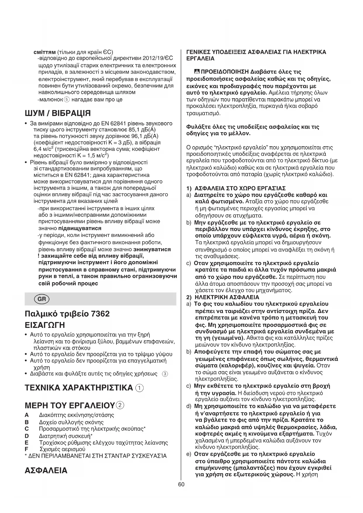 a) To φις του καλωδίου του ηλεκτρικού εργαλείου πρέπει να ταιριάζει στην αντίστοιχη πρίζα. Δεν επιτρέπεται με κανένα τρόπο η μετασκευή του φις. Μη χρησιμοποιείτε προσαρμοστικά φις σε συνδυασμό με ηλεκτρικά εργαλεία συνδεμένα με τη γη (γειωμένα). Αθικτα φις και κατάλληλες πρίζες μειώνουν τον κίνδυνο ηλεκτροπληξίας. b) Αποφεύγετε την επαφή του σώματος σας με γειωμένες επιφάνειες όπως σωλήνες, θερμαντικά σώματα (καλοριφέρ), κουζίνες και ψυγεία. Οταν το σώμα σας είναι γειωμένο αυξάνεται ο κίνδυνος ηλεκτροπληξίας. c) Μην εκθέτετε το ηλεκτρικό εργαλείο στη βροχή ή την υγρασία. Η διείσδυση νερού στο ηλεκτρικό εργαλείο αυξάνει τον κίνδυνο ηλκετροπληξίας. d) Μη χρησιμοποιείτε το καλώδιο για να μεταφέρετε ή ν’αναρτήσετε το ηλεκτρικό εργαλείο ή για να βγάλετε το φις από την πρίζα. Κρατάτε το καλώδιο μακριά από υψηλές θερμοκρασίες, λάδια, κοφτερές ακμές η κινούμενα εξαρτήματα. Τυχόν χαλασμένα ή μπερδεμένα καλώδια αυξάνουν τον κίνδυνο ηλεκτροπληξίας. e) Οταν εργάζεσθε με το ηλεκτρικό εργαλείο στο ύπαιθρο χρησιμοποιείτε πάντοτε καλώδια επιμήκυνσης (μπαλαντάζες) που έχουν εγκριθεί για χρήση σε εξωτερικούς χώρους. Η χρήση сміттям (тільки для країн ЄС) - відповідно до європейської директиви 2012/19/ЄС щодо утилізації старих електричних та електронних приладів, в залежності з місцевим законодавством, електроінструмент, який перебував в експлуатації повинен бути утилізований окремо, безпечним для навколишнього середовища шляхом