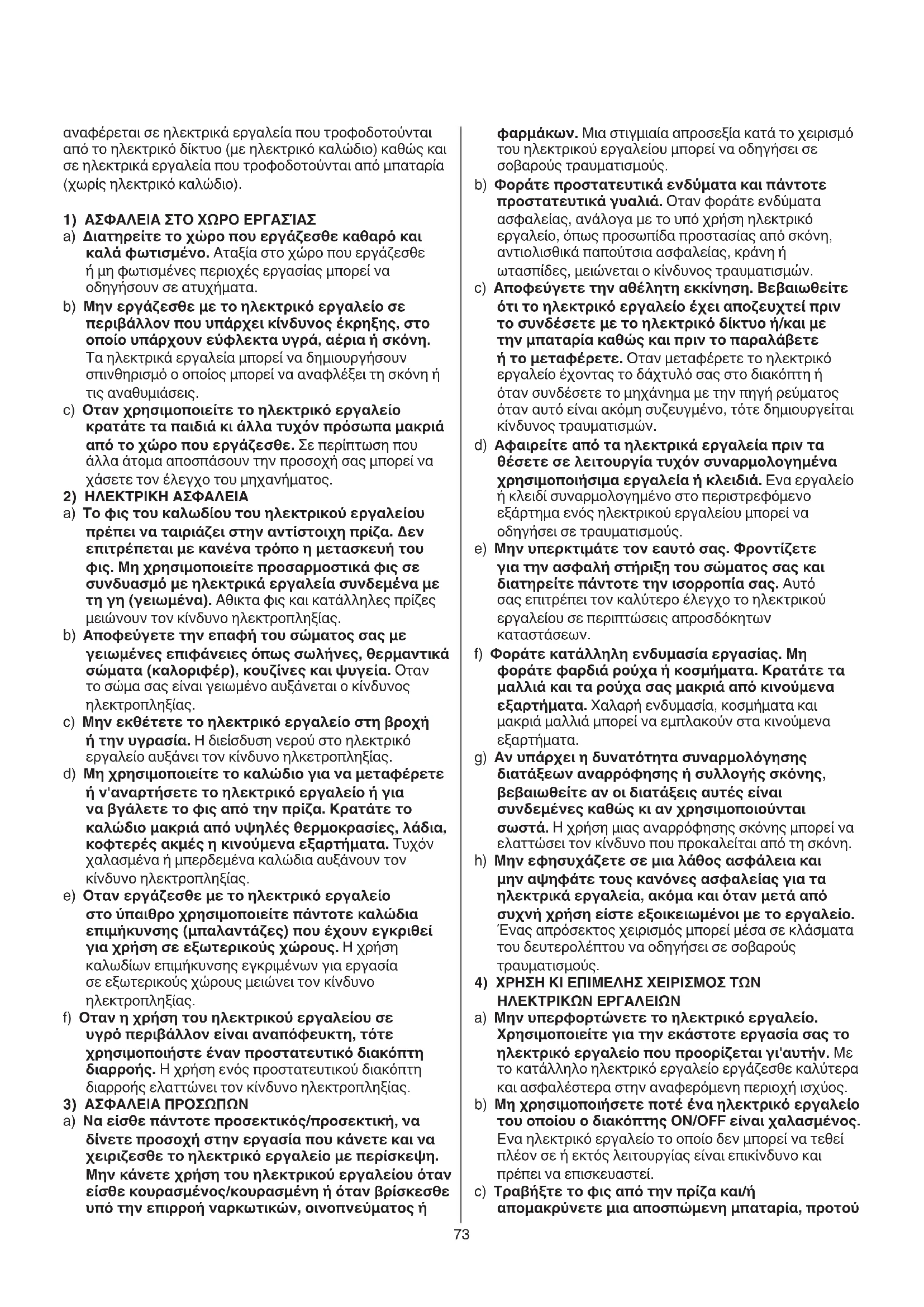 - Xρησιμοποιείτε μόνο εξαρτήματα των οποίων ο ύψιστος επιτρεπός αριθμός στροφών είναι τουλάχιστον τόσο υψηλός, όσο ο ύψιστος αριθμός στροφών χωρίς φορτιό του εργαλείου εκτελέσετε ρυθμίσεις στο ηλεκτρικό εργαλείο, προτού αλλάξετε εξαρτήματα ή φυλάξετε το ηλεκτρικό εργαλείο. Αυτά τα προληπτικά μέτρα ασφαλείας μειώνουν τον κίνδυνο από τυχόν αθέλητη εκκίνηση του ηλεκτρικού εργαλείου. d) Διαφυλάγετε τα ηλεκτρικά εργαλεία που δε χρησιμοποιείτε μακριά από παιδιά. Μην αφήνετε άτομα που δεν είναι εξοικειωμένα με το ηλεκτρικό εργαλείο ή δεν έχουν διαβάσει αυτές τις οδηγίες χρήσης να το χρησιμοποιήσουν. Τα ηλεκτρικά εργαλεία είναι επικίνδυνα όταν χρησιμοποιούνται από άπειρα πρόσωπα. e) Φροντίζετε τα ηλεκτρικά εργαλεία και τα εξάρτημα με επιμέλεια. Ελέγχετε, αν τα κινούμενα εξαρτήματα λειτουργούν άψογα, χωρίς να μπλοκάρουν, ή μήπως έχουν σπάσει ή φθαρεί τυχόν εξαρτήματα τα οποία επηρεάζουν τον τρόπο λειτουργίας του ηλεκτρικού εργαλείου. Δώστε αυτά τα χαλασμένα εξαρτήματα για επισκευή πριν τα ξαναχρησιμοποιήσετε. Η κακή συντήρηση των ηλεκτρικών εργαλείων αποτελεί αιτία πολλών ατυχημάτων. f) Διατηρείτε τα κοπτικά εργαλεία κοφτερά και καθαρά. Τα κοπτικά εργαλεία που συντηρούνται με προσοχή μπορούν να οδηγηθούν εύκολα και να ελεγχθούν καλύτερα. g) Xρησιμοποιείτε τα ηλεκτρικά εργαλεία, τα εξαρτήματα, τα χρησιμοποιήσιμα εργαλεία κτλ. σύμφωνα με τις παρούσες οδηγίες καθώς. Λαμβάνετε ταυτόχρονα υπόψην σας τις συνθήκες εργασίας και την υπό εκτέλεση εργασία. Η χρήση του ηλεκτρικού εργαλείου για άλλες εκτός από τις προβλεπόμενες εργασίες μπορεί να δημιουργήσει επικίνδυνες καταστάσεις. h) Διατηρείτε τις λαβές και επιφάνειες λαβής στεγνές, καθαρές και ελεύθερες από λάδι και γράσο. Οι ολισθηρές λαβές και επιφάνειες λαβής δεν επιτρέπουν κανέναν ασφαλή χειρισμό και έλεγχο του ηλεκτρικού εργαλείου σε τυχόν απρόβλεπτες καταστάσεις.