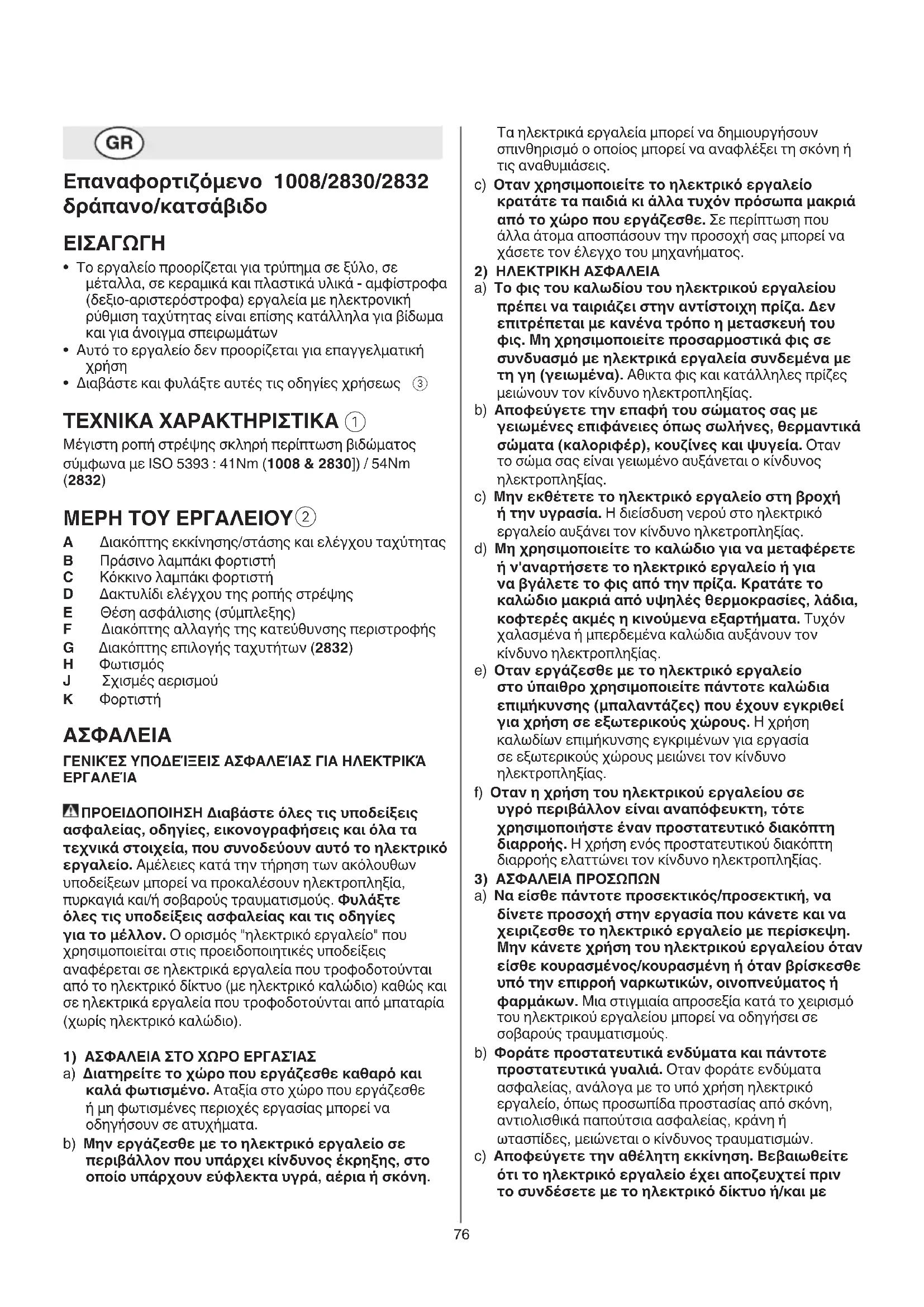 a) Να είσθε πάντοτε προσεκτικός/προσεκτική, να δίνετε προσοχή στην εργασία που κάνετε και να χειριζεσθε το ηλεκτρικό εργαλείο με περίσκεψη. Μην κάνετε χρήση του ηλεκτρικού εργαλείου όταν είσθε κουρασμένος/κουρασμένη ή όταν βρίσκεσθε υπό την επιρροή ναρκωτικών, οινοπνεύματος ή φαρμάκων. Μια στιγμιαία απροσεξία κατά το χειρισμό του ηλεκτρικού εργαλείου μπορεί να οδηγήσει σε σοβαρούς τραυματισμούς. b) Φοράτε προστατευτικά ενδύματα και πάντοτε προστατευτικά γυαλιά. Οταν φοράτε ενδύματα ασφαλείας, ανάλογα με το υπό χρήση ηλεκτρικό εργαλείο, όπως προσωπίδα προστασίας από σκόνη, αντιολισθικά παπούτσια ασφαλείας, κράνη ή ωτασπίδες, μειώνεται ο κίνδυνος τραυματισμών. c) Αποφεύγετε την αθέλητη εκκίνηση. Βεβαιωθείτε ότι το ηλεκτρικό εργαλείο έχει αποζευχτεί πριν το συνδέσετε με το ηλεκτρικό δίκτυο ή/και με Επαναφορτιζόμενο 1008/2830/2832 δράπανο/κατσάβιδο