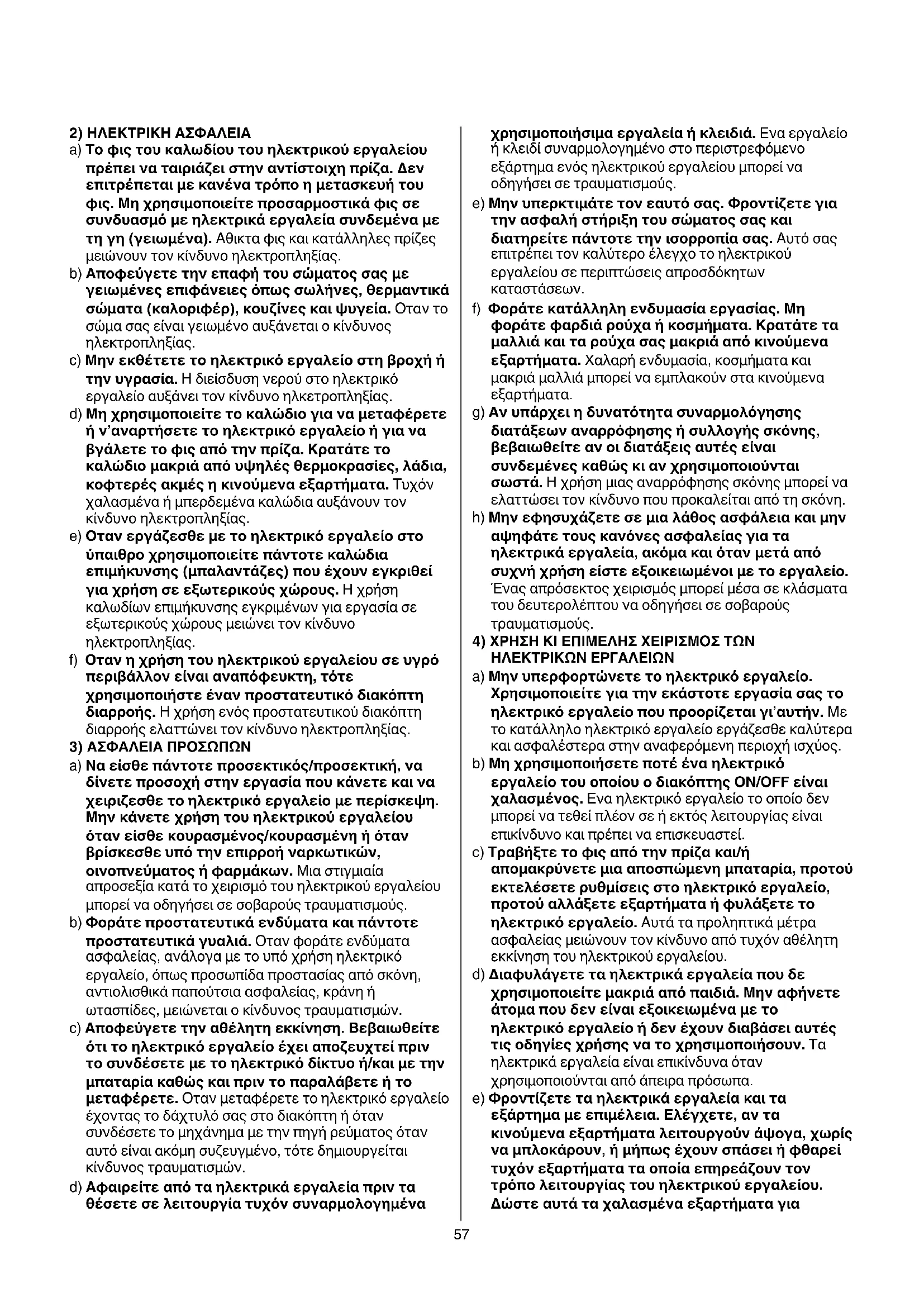a) Μην υπερφορτώνετε το ηλεκτρικό εργαλείο. Xρησιμοποιείτε για την εκάστοτε εργασία σας το ηλεκτρικό εργαλείο που προορίζεται γι’αυτήν. Με το κατάλληλο ηλεκτρικό εργαλείο εργάζεσθε καλύτερα και ασφαλέστερα στην αναφερόμενη περιοχή ισχύος. b) Μη χρησιμοποιήσετε ποτέ ένα ηλεκτρικό εργαλείο του οποίου ο διακόπτης ON/OFF είναι χαλασμένος. Eνα ηλεκτρικό εργαλείο το οποίο δεν μπορεί να τεθεί πλέον σε ή εκτός λειτουργίας είναι επικίνδυνο και πρέπει να επισκευαστεί. c) Τραβήξτε το φις από την πρίζα και/ή απομακρύνετε μια αποσπώμενη μπαταρία, προτού εκτελέσετε ρυθμίσεις στο ηλεκτρικό εργαλείο, προτού αλλάξετε εξαρτήματα ή φυλάξετε το ηλεκτρικό εργαλείο. Αυτά τα προληπτικά μέτρα ασφαλείας μειώνουν τον κίνδυνο από τυχόν αθέλητη εκκίνηση του ηλεκτρικού εργαλείου. d) Διαφυλάγετε τα ηλεκτρικά εργαλεία που δε χρησιμοποιείτε μακριά από παιδιά. Μην αφήνετε άτομα που δεν είναι εξοικειωμένα με το ηλεκτρικό εργαλείο ή δεν έχουν διαβάσει αυτές τις οδηγίες χρήσης να το χρησιμοποιήσουν. Τα ηλεκτρικά εργαλεία είναι επικίνδυνα όταν χρησιμοποιούνται από άπειρα πρόσωπα. e) Φροντίζετε τα ηλεκτρικά εργαλεία και τα εξάρτημα με επιμέλεια. Ελέγχετε, αν τα κινούμενα εξαρτήματα λειτουργούν άψογα, χωρίς να μπλοκάρουν, ή μήπως έχουν σπάσει ή φθαρεί τυχόν εξαρτήματα τα οποία επηρεάζουν τον τρόπο λειτουργίας του ηλεκτρικού εργαλείου. Δώστε αυτά τα χαλασμένα εξαρτήματα για58 επισκευή πριν τα ξαναχρησιμοποιήσετε. Η κακή συντήρηση των ηλεκτρικών εργαλείων αποτελεί αιτία πολλών ατυχημάτων. f) Διατηρείτε τα κοπτικά εργαλεία κοφτερά και καθαρά. Τα κοπτικά εργαλεία που συντηρούνται με προσοχή μπορούν να οδηγηθούν εύκολα και να ελεγχθούν καλύτερα. g) Xρησιμοποιείτε τα ηλεκτρικά εργαλεία, τα εξαρτήματα, τα χρησιμοποιήσιμα εργαλεία κτλ. σύμφωνα με τις παρούσες οδηγίες καθώς. Λαμβάνετε ταυτόχρονα υπόψην σας τις συνθήκες εργασίας και την υπό εκτέλεση εργασία. Η χρήση του ηλεκτρικού εργαλείου για άλλες εκτός από τις προβλεπόμενες εργασίες μπορεί να δημιουργήσει επικίνδυνες καταστάσεις. h) Διατηρείτε τις λαβές και επιφάνειες λαβής στεγνές, καθαρές και ελεύθερες από λάδι και γράσο. Οι ολισθηρές λαβές και επιφάνειες λαβής δεν επιτρέπουν κανέναν ασφαλή χειρισμό και έλεγχο του ηλεκτρικού εργαλείου σε τυχόν απρόβλεπτες καταστάσεις.