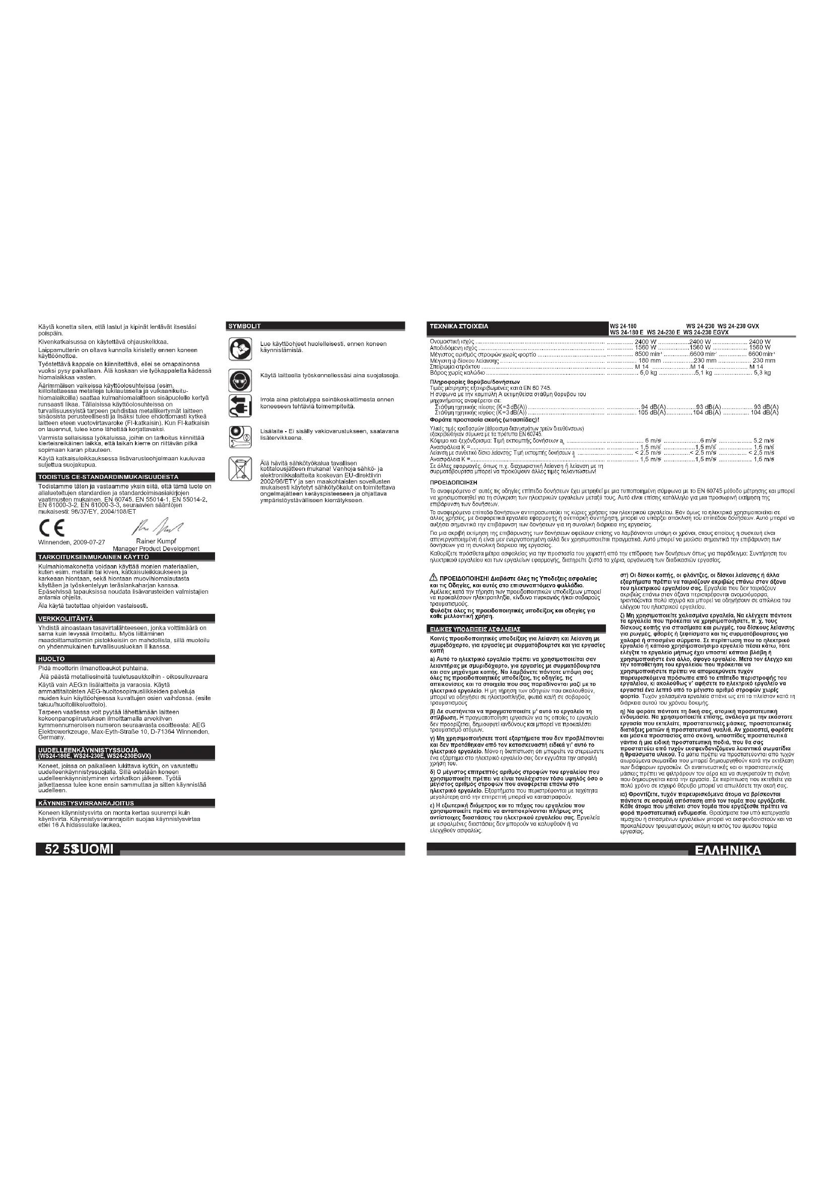 ΠΡΟEIΔΟΠΟIΗΣΗ Το αναφερόμενο σ’ αυτές τις οδηγίες επίπεδο δονήσεων έχει μετρηθεί με μια τυποποιημένη σύμφωνα με το EN 60745 μέθοδο μέτρησης και μπορεί να χρησιμοποιηθεί για τη σύγκριση των ηλεκτρικών εργαλείων μεταξύ τους. Αυτό είναι επίσης κατάλληλο για μια προσωρινή εκτίμηση της επιβάρυνση των δονήσεων. Το αναφερόμενο επίπεδο δονήσεων αντιπροσωπεύει τις κύριες χρήσεις του ηλεκτρικού εργαλείου. Εάν όμως το ηλεκτρικό χρησιμοποιείται σε άλλες χρήσεις, με διαφορετικά εργαλεία εφαρμογής ή ανεπαρκή συντήρηση, μπορεί να υπάρξει απόκλιση του επιπέδου δονήσεων. Αυτό μπορεί να αυξήσει σημαντικά την επιβάρυνση των δονήσεων για τη συνολική διάρκεια της εργασίας. Για μια ακριβή εκτίμηση της επιβάρυνσης των δονήσεων οφείλουν επίσης να λαμβάνονται υπόψη οι χρόνοι, στους οποίους η συσκευή είναι απενεργοποιημένη ή είναι μεν ενεργοποιημένη αλλά δεν χρησιμοποιείται πραγματικά. Αυτό μπορεί να μειώσει σημαντικά την επιβάρυνση των δονήσεων για τη συνολική διάρκεια της εργασίας. Καθορίζετε πρόσθετα μέτρα ασφαλείας για την προστασία του χειριστή από την επίδραση των δονήσεων όπως για παράδειγμα: Συντήρηση του ηλεκτρικού εργαλείου και των εργαλείων εφαρμογής, διατηρείτε ζεστά τα χέρια, οργάνωση των διαδικασιών εργασίας. Käytä konetta siten, että lastut ja kipinät lentävät itsestäsi poispäin. Kivenkatkaisussa on käytettävä ohjauskelkkaa. Laippamutterin on oltava kunnolla kiristetty ennen koneen käyttöönottoa. Työstettävä kappale on kiinnitettävä, ellei se omapainonsa vuoksi pysy paikallaan. Älä koskaan vie työkappaletta kädessä hiomalaikkaa vasten. Äärimmäisen vaikeissa käyttöolosuhteissa (esim. kiilloitettaessa metalleja tukilautasella ja vulkaanikuitu- hiomalaikoilla) saattaa kulmahiomalaitteen sisäpuolelle kertyä runsaasti likaa. Tällaisissa käyttöolosuhteissa on turvallisuussyistä tarpeen puhdistaa metallikertymät laitteen sisäosista perusteellisesti ja lisäksi tulee ehdottomasti kytkeä laitteen eteen vuotovirtavaroke (FI-katkaisin). Kun FI-katkaisin on lauennut, tulee kone lähettää korjattavaksi. Varmista sellaisissa työkaluissa, joihin on tarkoitus kiinnittää kierteisreikäinen laikka, että laikan kierre on riittävän pitkä sopimaan karan pituuteen. Käytä katkaisuleikkauksessa lisävarusteohjelmaan kuuluvaa suljettua suojakupua. TODISTUS CE-STANDARDINMUKAISUUDESTA Todistamme täten ja vastaamme yksin siitä, että tämä tuote on allalueteltujen standardien ja standardoimisasiakirjojen vaatimusten mukainen. EN 60745, EN 55014-1, EN 55014-2, EN 61000-3-2, EN 61000-3-3, seuraavien sääntöjen mukaisesti: 98/37/EY, 2004/108/ET Rainer Kumpf Manager Product Development Winnenden, 2009-07-27