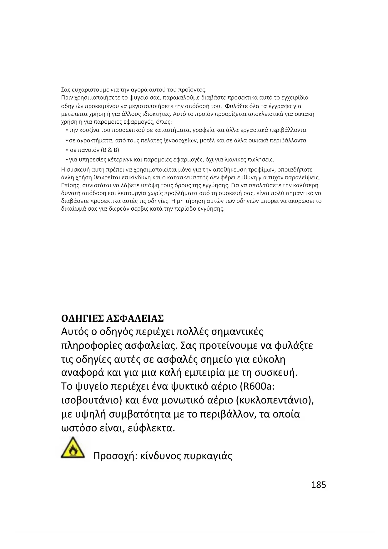 ΟΔΗΓΙΕΣ ΑΣΦΑΛΕΙΑΣ Αυτός ο οδηγός περιέχει πολλές σημαντικές πληροφορίες ασφαλείας. Σας προτείνουμε να φυλάξτε τις οδηγίες αυτές σε ασφαλές σημείο για εύκολη αναφορά και για μια καλή εμπειρία με τη συσκευή. Το ψυγείο περιέχει ένα ψυκτικό αέριο (R600a: ισοβουτάνιο) και ένα μονωτικό αέριο (κυκλοπεντάνιο), με υψηλή συμβατότητα με το περιβάλλον, τα οποία ωστόσο είναι, εύφλεκτα. Προσοχή: κίνδυνος πυρκαγιάς186 Εάν τυχόν το ψυκτικό κύκλωμα υποστεί βλάβη: Αποφύγετε τις γυμνές φλόγες και τις πηγές
