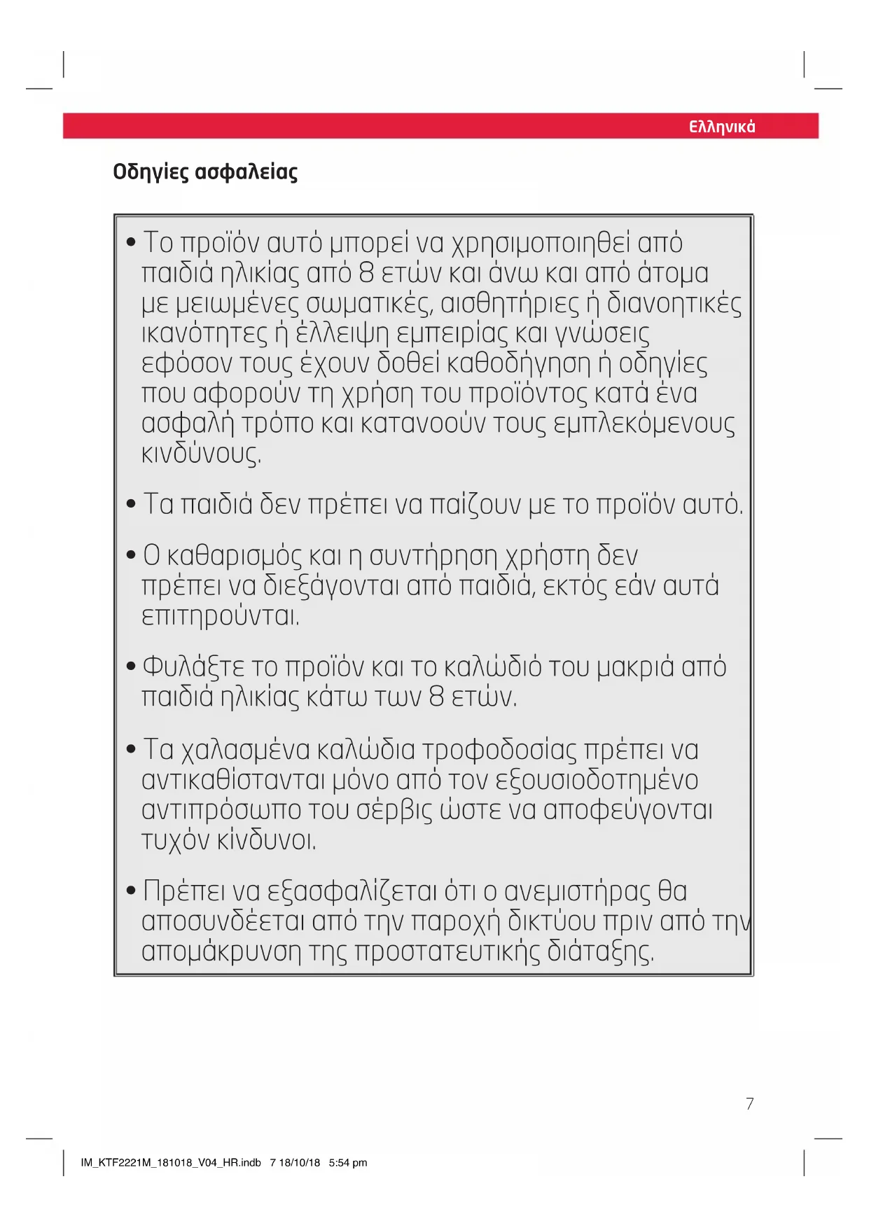 - Πρέπει να εξασφαλίζεται ότι ο ανεμιστήρας θα αποσυνδέεται από την παροχή δικτύου πριν από την απομάκρυνση της προστατευτικής διάταξης. IM_KTF2221M_181018_V04_HR.indb 7 18/10/18 5:54 pmΕλληνικά