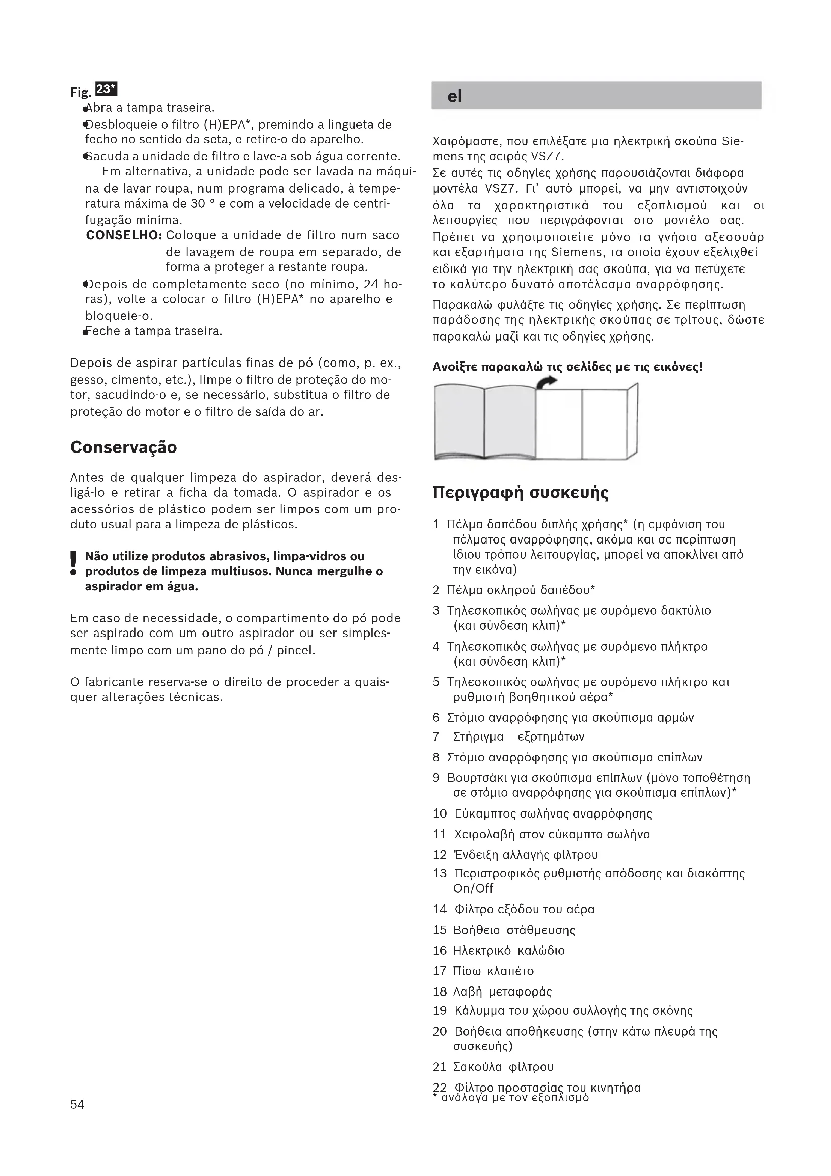 Χαιρόμαστε, που επιλέξατε μια ηλεκτρική σκούπα Sie- mens της σειράς VSZ7. Σε αυτές τις οδηγίες χρήσης παρουσιάζονται διάφορα μοντέλα VSZ7. Γι’ αυτό μπορεί, να μην αντιστοιχούν όλα τα χαρακτηριστικά του εξοπλισμού και οι λειτουργίες που περιγράφονται στο μοντέλο σας. Πρέπει να χρησιμοποιείτε μόνο τα γνήσια αξεσουάρ και εξαρτήματα της Siemens, τα οποία έχουν εξελιχθεί ειδικά για την ηλεκτρική σας σκούπα, για να πετύχετε το καλύτερο δυνατό αποτέλεσμα αναρρόφησης. Παρακαλώ φυλάξτε τις οδηγίες χρήσης. Σε περίπτωση παράδοσης της ηλεκτρικής σκούπας σε τρίτους, δώστε παρακαλώ μαζί και τις οδηγίες χρήσης. Ανοίξτε παρακαλώ τις σελίδες με τις εικόνες! Περιγραφή συσκευής 1 Πέλμα δαπέδου διπλής χρήσης* (η εμφάνιση του πέλματος αναρρόφησης, ακόμα και σε περίπτωση ίδιου τρόπου λειτουργίας, μπορεί να αποκλίνει από την εικόνα) 2 Πέλμα σκληρού δαπέδου* 3 Τηλεσκοπικός σωλήνας με συρόμενο δακτύλιο (και σύνδεση κλιπ)* 4 Τηλεσκοπικός σωλήνας με συρόμενο πλήκτρο (και σύνδεση κλιπ)* 5 Τηλεσκοπικός σωλήνας με συρόμενο πλήκτρο και ρυθμιστή βοηθητικού αέρα* 6 Στόμιο αναρρόφησης για σκούπισμα αρμών 7 Στήριγμα εξρτημάτων 8 Στόμιο αναρρόφησης για σκούπισμα επίπλων 9 Βουρτσάκι για σκούπισμα επίπλων (μόνο τοποθέτηση σε στόμιο αναρρόφησης για σκούπισμα επίπλων)* 10 Εύκαμπτος σωλήνας αναρρόφησης 11 Χειρολαβή στον εύκαμπτο σωλήνα 12 Ένδειξη αλλαγής φίλτρου 13 Περιστροφικός ρυθμιστής απόδοσης και διακόπτης On/Off 14 Φίλτρο εξόδου του αέρα 15 Βοήθεια στάθμευσης 16 Ηλεκτρικό καλώδιο 17 Πίσω κλαπέτο 18 Λαβή μεταφοράς 19 Κάλυμμα του χώρου συλλογής της σκόνης 20 Βοήθεια αποθήκευσης (στην κάτω πλευρά της
