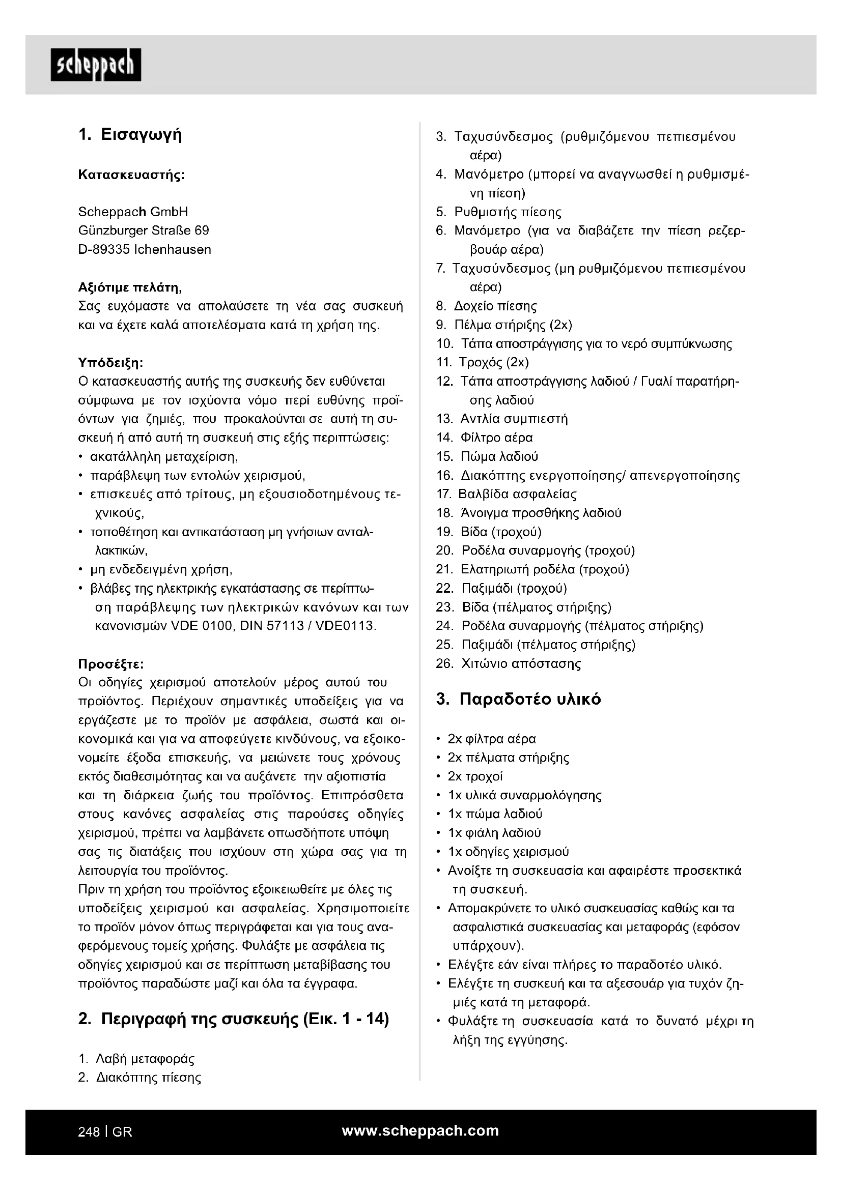 Κατασκευαστής: Scheppach GmbH Günzburger Straße 69 D-89335 Ichenhausen Αξιότιμε πελάτη, Σας ευχόμαστε να απολαύσετε τη νέα σας συσκευή και να έχετε καλά αποτελέσματα κατά τη χρήση της.