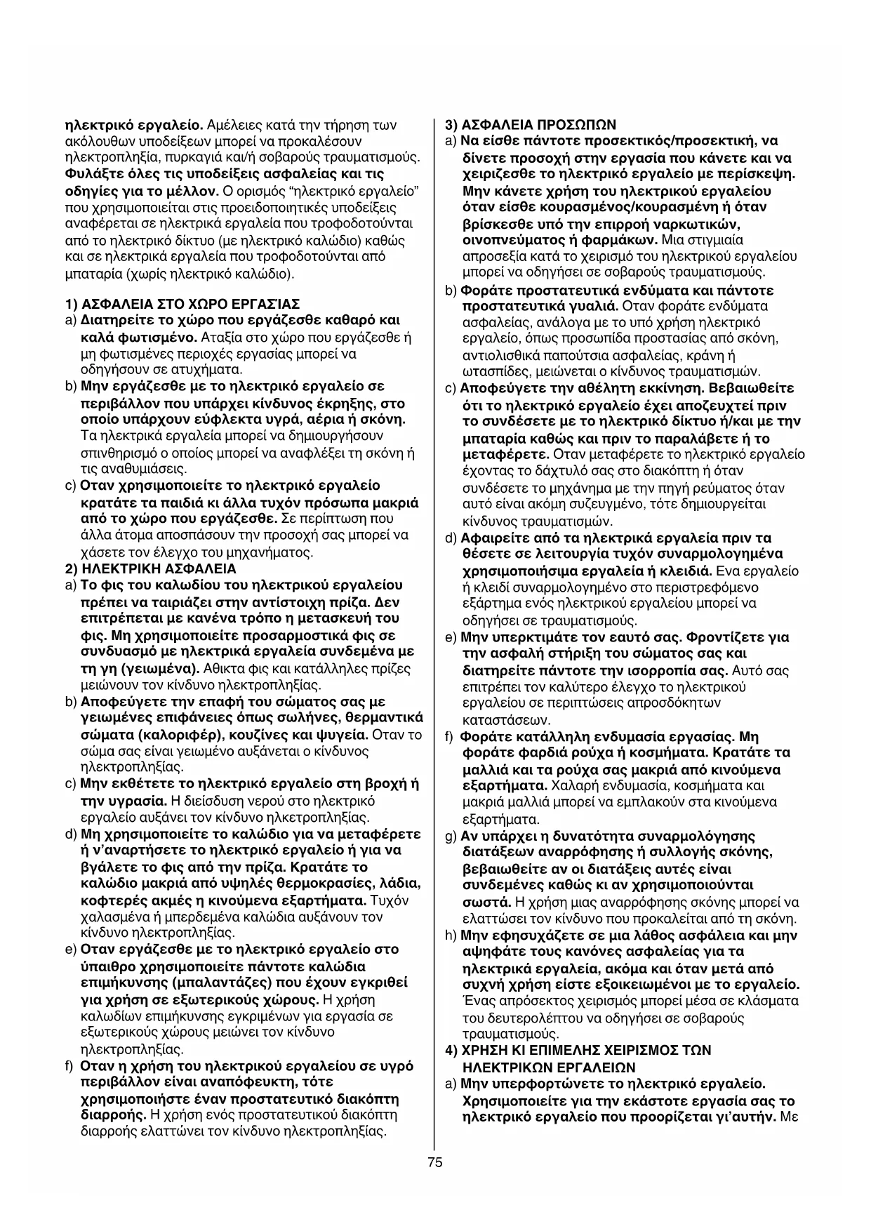 a) Μην υπερφορτώνετε το ηλεκτρικό εργαλείο. Xρησιμοποιείτε για την εκάστοτε εργασία σας το ηλεκτρικό εργαλείο που προορίζεται γι’αυτήν. Με76 το κατάλληλο ηλεκτρικό εργαλείο εργάζεσθε καλύτερα και ασφαλέστερα στην αναφερόμενη περιοχή ισχύος. b) Μη χρησιμοποιήσετε ποτέ ένα ηλεκτρικό εργαλείο του οποίου ο διακόπτης ON/OFF είναι χαλασμένος. Eνα ηλεκτρικό εργαλείο το οποίο δεν μπορεί να τεθεί πλέον σε ή εκτός λειτουργίας είναι επικίνδυνο και πρέπει να επισκευαστεί. c) Τραβήξτε το φις από την πρίζα και/ή απομακρύνετε μια αποσπώμενη μπαταρία, προτού εκτελέσετε ρυθμίσεις στο ηλεκτρικό εργαλείο, προτού αλλάξετε εξαρτήματα ή φυλάξετε το ηλεκτρικό εργαλείο. Αυτά τα προληπτικά μέτρα ασφαλείας μειώνουν τον κίνδυνο από τυχόν αθέλητη εκκίνηση του ηλεκτρικού εργαλείου. d) Διαφυλάγετε τα ηλεκτρικά εργαλεία που δε χρησιμοποιείτε μακριά από παιδιά. Μην αφήνετε άτομα που δεν είναι εξοικειωμένα με το ηλεκτρικό εργαλείο ή δεν έχουν διαβάσει αυτές τις οδηγίες χρήσης να το χρησιμοποιήσουν. Τα ηλεκτρικά εργαλεία είναι επικίνδυνα όταν χρησιμοποιούνται από άπειρα πρόσωπα. e) Φροντίζετε τα ηλεκτρικά εργαλεία και τα εξάρτημα με επιμέλεια. Ελέγχετε, αν τα κινούμενα εξαρτήματα λειτουργούν άψογα, χωρίς να μπλοκάρουν, ή μήπως έχουν σπάσει ή φθαρεί τυχόν εξαρτήματα τα οποία επηρεάζουν τον τρόπο λειτουργίας του ηλεκτρικού εργαλείου. Δώστε αυτά τα χαλασμένα εξαρτήματα για επισκευή πριν τα ξαναχρησιμοποιήσετε. Η κακή συντήρηση των ηλεκτρικών εργαλείων αποτελεί αιτία πολλών ατυχημάτων. f) Διατηρείτε τα κοπτικά εργαλεία κοφτερά και καθαρά. Τα κοπτικά εργαλεία που συντηρούνται με προσοχή μπορούν να οδηγηθούν εύκολα και να ελεγχθούν καλύτερα. g) Xρησιμοποιείτε τα ηλεκτρικά εργαλεία, τα εξαρτήματα, τα χρησιμοποιήσιμα εργαλεία κτλ. σύμφωνα με τις παρούσες οδηγίες καθώς. Λαμβάνετε ταυτόχρονα υπόψην σας τις συνθήκες εργασίας και την υπό εκτέλεση εργασία. Η χρήση του ηλεκτρικού εργαλείου για άλλες εκτός από τις προβλεπόμενες εργασίες μπορεί να δημιουργήσει επικίνδυνες καταστάσεις. h) Διατηρείτε τις λαβές και επιφάνειες λαβής στεγνές, καθαρές και ελεύθερες από λάδι και γράσο. Οι ολισθηρές λαβές και επιφάνειες λαβής δεν επιτρέπουν κανέναν ασφαλή χειρισμό και έλεγχο του ηλεκτρικού εργαλείου σε τυχόν απρόβλεπτες καταστάσεις.
