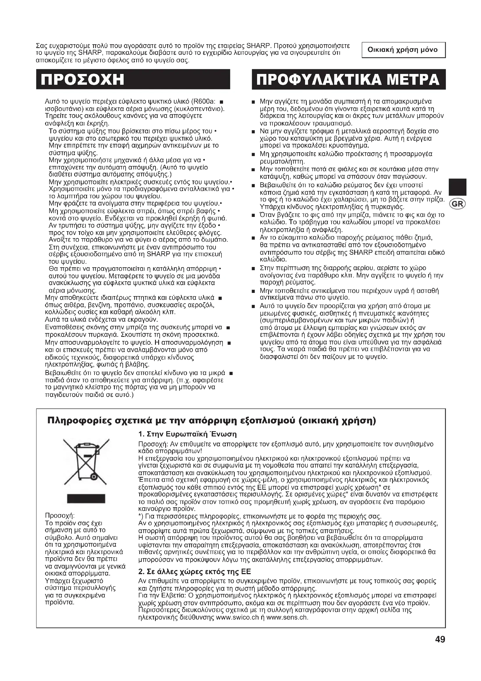 Στην περίπτωση της διαρροής αερίου, αερίστε το χώρο ■ ανοίγοντας ένα παράθυρο κλπ. Μην αγγίξετε το ψυγείο ή την παροχή ρεύματος. Μην τοποθετείτε αντικείμενα που περιέχουν υγρά ή ασταθή ■ αντικείμενα πάνω στο ψυγείο. Αυτό το ψυγείο δεν προορίζεται για χρήση από άτομα με ■ μειωμένες φυσικές, αισθητικές ή πνευματικές ικανότητες (συμπεριλαμβανομένων και των μικρών παιδιών) ή από άτομα με έλλειψη εμπειρίας και γνώσεων εκτός αν επιβλέπονται ή έχουν λάβει οδηγίες σχετικά με την χρήση του ψυγείου από τα άτομα που είναι υπεύθυνα για την ασφάλειά τους. Τα νεαρά παιδιά θα πρέπει να επιβλέπονται για να διασφαλιστεί ότι δεν παίζουν με το ψυγείο. Πληροφορίες σχετικά με την απόρριψη εξοπλισμού (οικιακή χρήση)