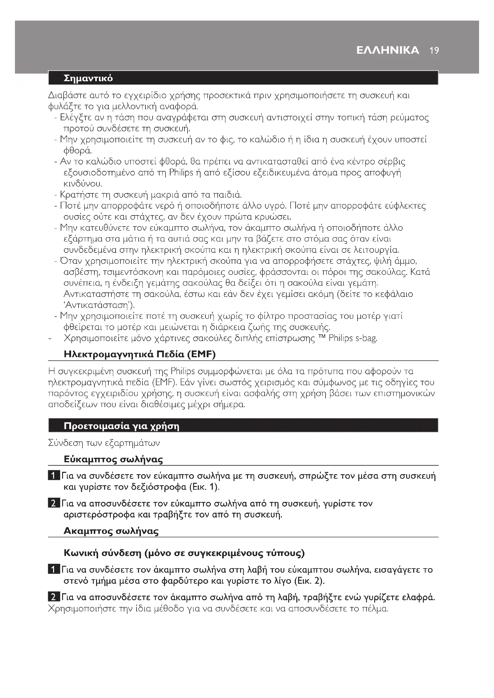 - Κρατήστε τη συσκευή μακριά από τα παιδιά. - Ποτέ μην απορροφάτε νερό ή οποιοδήποτε άλλο υγρό. Ποτέ μην απορροφάτε εύφλεκτες ουσίες ούτε και στάχτες, αν δεν έχουν πρώτα κρυώσει. - Μην κατευθύνετε τον εύκαμπτο σωλήνα, τον άκαμπτο σωλήνα ή οποιοδήποτε άλλο εξάρτημα στα μάτια ή τα αυτιά σας και μην τα βάζετε στο στόμα σας όταν είναι συνδεδεμένα στην ηλεκτρική σκούπα και η ηλεκτρική σκούπα είναι σε λειτουργία. - Όταν χρησιμοποιείτε την ηλεκτρική σκούπα για να απορροφήσετε στάχτες, ψιλή άμμο, ασβέστη, τσιμεντόσκονη και παρόμοιες ουσίες, φράσσονται οι πόροι της σακούλας. Κατά συνέπεια, η ένδειξη γεμάτης σακούλας θα δείξει ότι η σακούλα είναι γεμάτη. Αντικαταστήστε τη σακούλα, έστω και εάν δεν έχει γεμίσει ακόμη (δείτε το κεφάλαιο ‘Αντικατάσταση’). - Μην χρησιμοποιείτε ποτέ τη συσκευή χωρίς το φίλτρο προστασίας του μοτέρ γιατί φθείρεται το μοτέρ και μειώνεται η διάρκεια ζωής της συσκευής. - Χρησιμοποιείτε μόνο χάρτινες σακούλες διπλής επίστρωσης ` Philips s-bag.