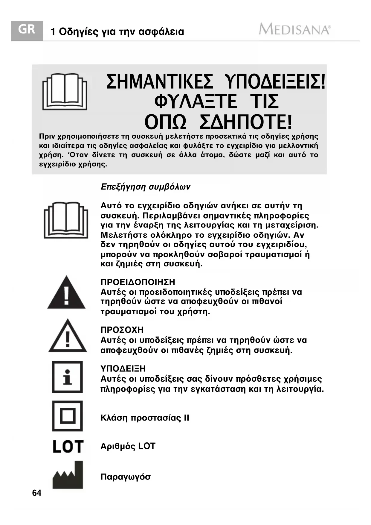 - Αν το καλώδιο ρεύματος είναι χαλασμένο, επιτρέπεται να αντικατασταθεί από την MEDISANA, από ένα ειδικό κατάστημα ή από ένα κατάλληλα εξειδικευμένο άτομο.
