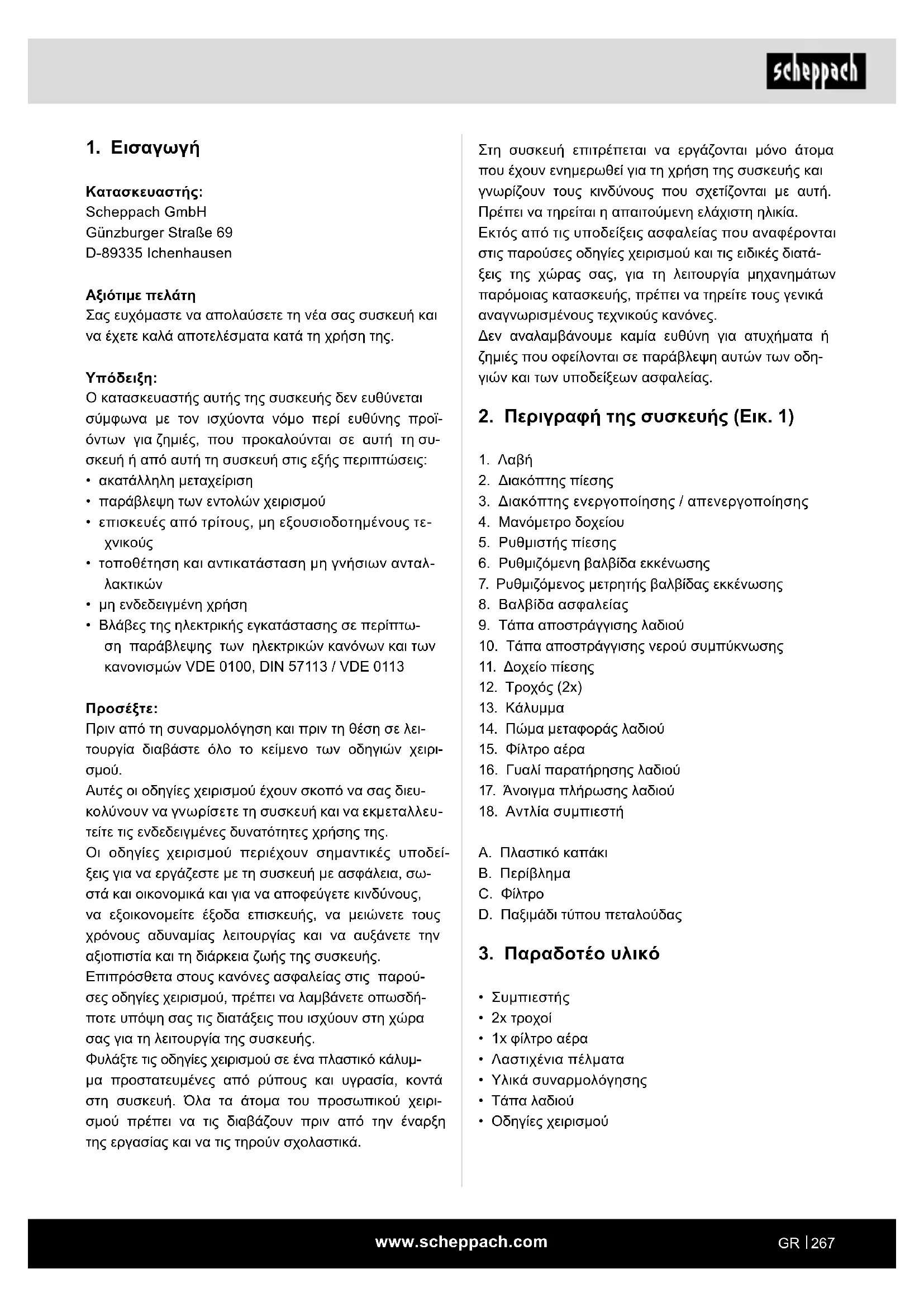 Κατασκευαστής: Scheppach GmbH Günzburger Straße 69 D-89335 Ichenhausen Αξιότιμε πελάτη Σας ευχόμαστε να απολαύσετε τη νέα σας συσκευή και να έχετε καλά αποτελέσματα κατά τη χρήση της.
