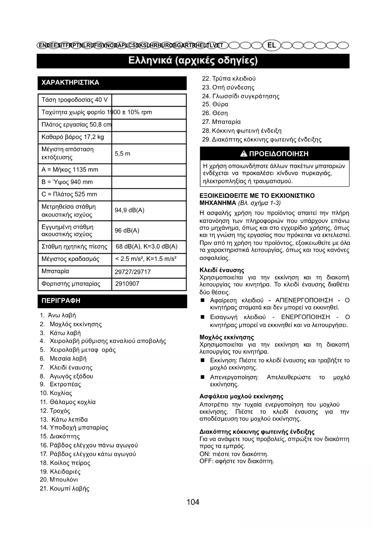 103EL EN DE ES IT FR PT NL RU FI SV NO DA PL CS SK SL HR HU RO BG AR TR HE LT LV ET ΧΑΡΑΚΤΗΡΙΣΤΙΚΑ Τάση τροφοδοσίας 40 V Ταχύτητα χωρίς φορτίο 1900 ± 10% rpm Πλάτος εργασίας 50,8 cm Καθαρό βάρος 17,2 kg Μέγιστη απόσταση