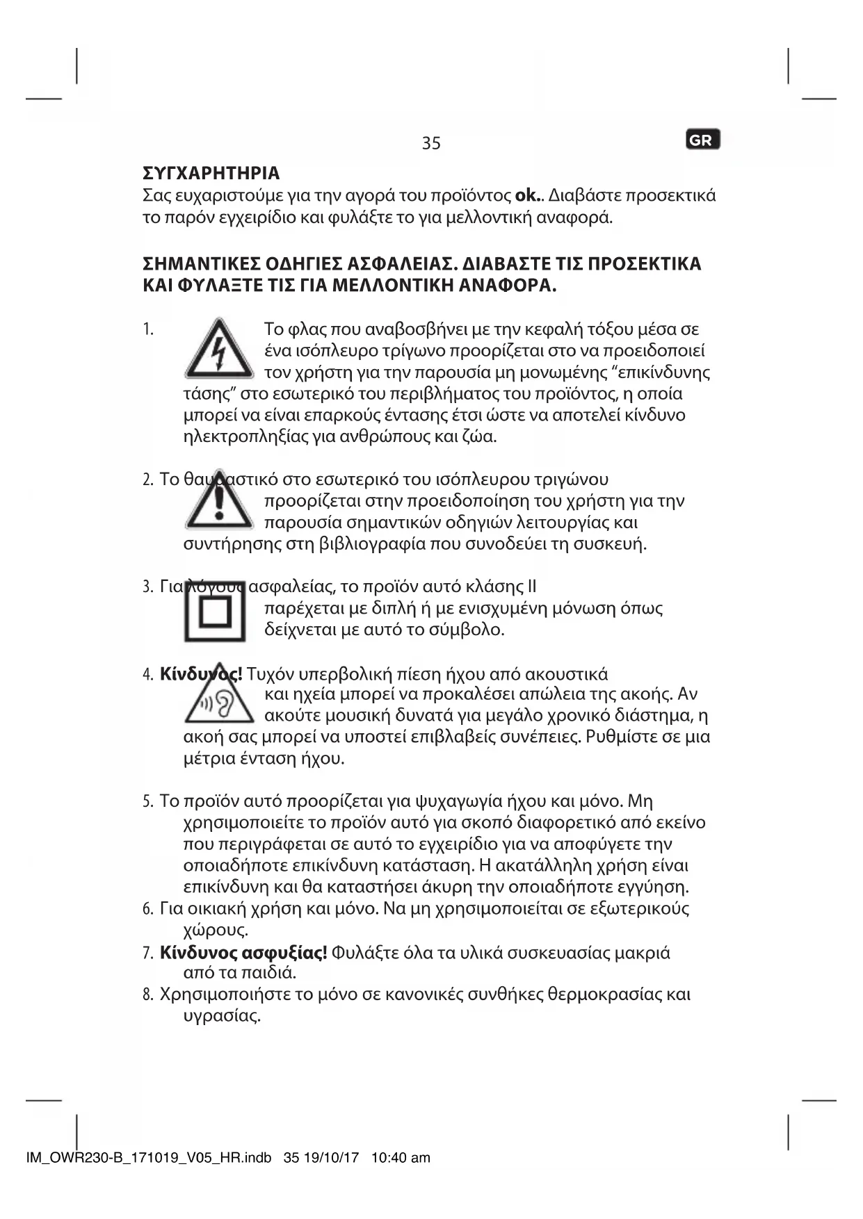 Μην απορρίπτετε τη συσκευή σαν αστικό απόβλητο. Επιστρέψτε το σε κατάλληλο σημείο ανακύκλωσης ηλεκτρικού και ηλεκτρονικού εξοπλισμού. Επικοινωνήστε με τον έμπορο σας ή τις τοπικές αρχές για περισσότερες πληροφορίες. Παρακαλούμε απορρίπτετε τις μπαταρίες με έναν φιλικό για το περιβάλλον τρόπο. Μην τις ρίχνετε στα οικιακά απορρίμματα. Παρακαλούμε χρησιμοποιείτε τα σημεία επιστροφής και συγκέντρωσης στην κοινότητα σας ή επικοινωνείτε με τον αντιπρόσωπο, στον οποίο αγοράσατε το προϊόν. IM_OWR230-B_171019_V05_HR.indb 42 19/10/17 10:40 am43