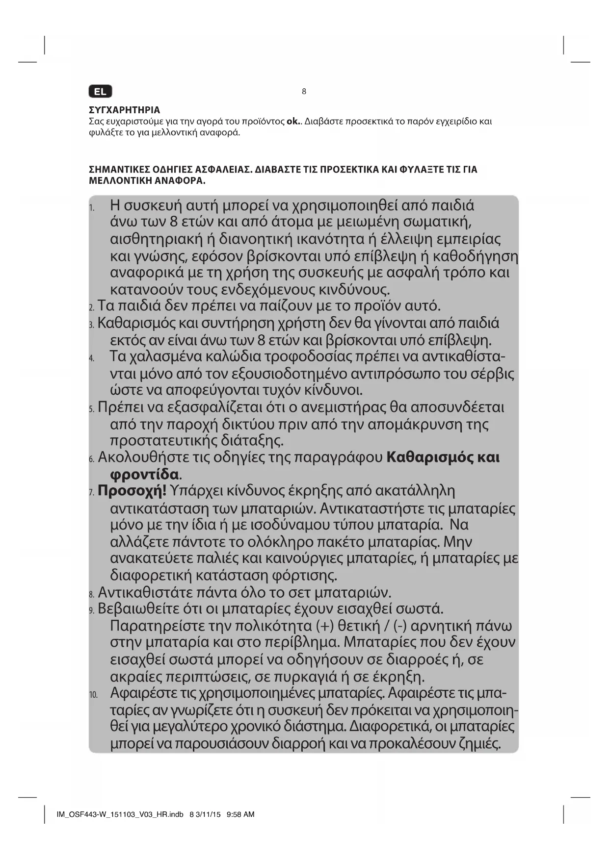 ταρίες αν γνωρίζετε ότι η συσκευή δεν πρόκειται να χρησιμοποιη- θεί για μεγαλύτερο χρονικό διάστημα. Διαφορετικά, οι μπαταρίες μπορεί να παρουσιάσουν διαρροή και να προκαλέσουν ζημιές. IM_OSF443-W_151103_V03_HR.indb 8 3/11/15 9:58 AM9