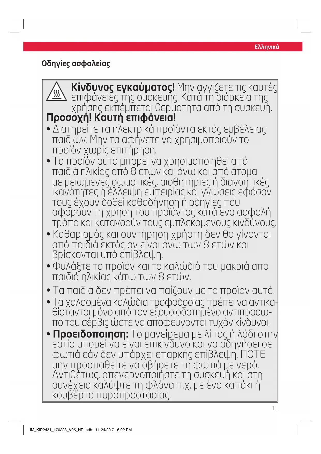 - Προειδοποιηση: Το μαγείρεμα με λίπος ή λάδι στην εστία μπορεί να είναι επικίνδυνο και να οδηγήσει σε φωτιά εάν δεν υπάρχει επαρκής επίβλεψη. ΠΟΤΕ μην προσπαθείτε να σβήσετε τη φωτιά με νερό. Αντιθέτως, απενεργοποιήστε τη συσκευή και στη συνέχεια καλύψτε τη φλόγα π.χ. με ένα καπάκι ή κουβέρτα πυροπροστασίας. IM_KIP2431_170223_V05_HR.indb 11 24/2/17 6:02 PMΕλληνικά