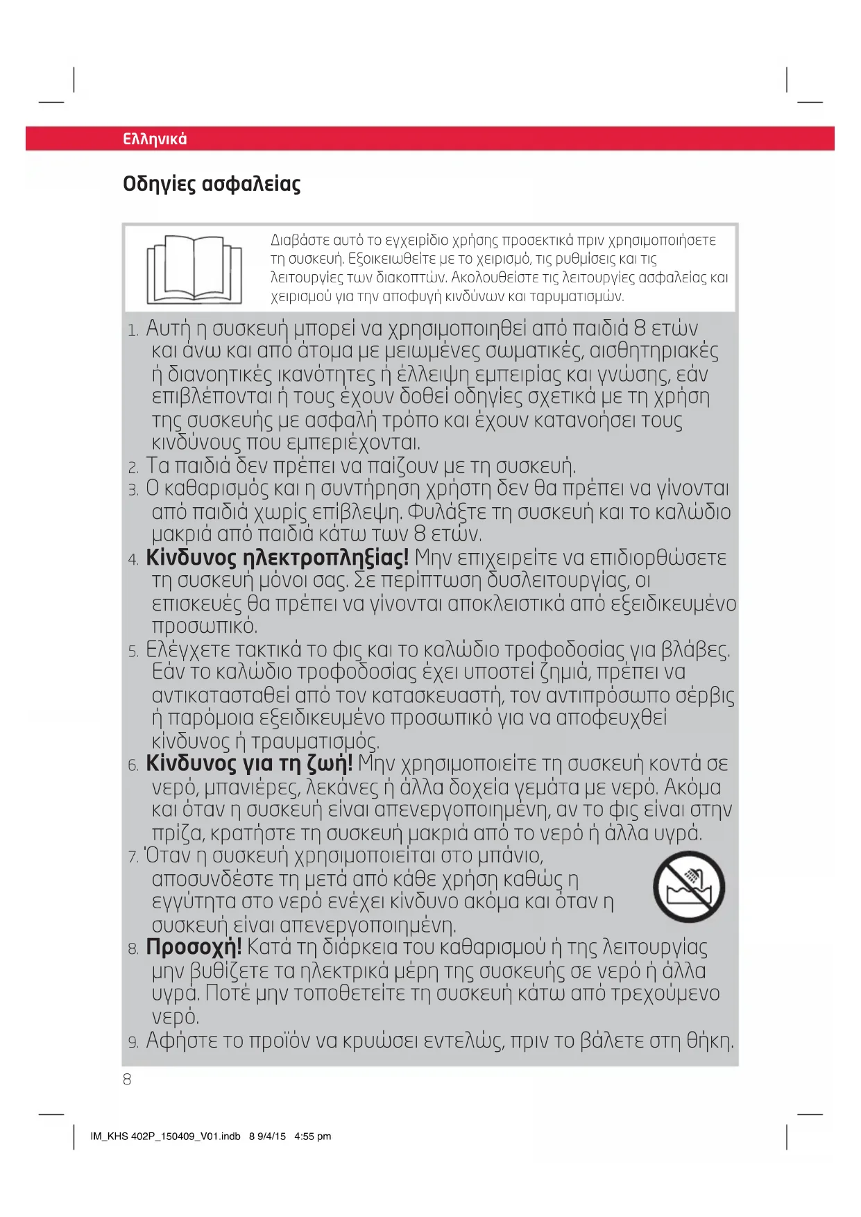 Διαβάστε αυτό το εγχειρίδιο χρήσης προσεκτικά πριν χρησιμοποιήσετε τη συσκευή. Εξοικειωθείτε με το χειρισμό, τις ρυθμίσεις και τις λειτουργίες των διακοπτών. Ακολουθείστε τις λειτουργίες ασφαλείας και χειρισμού για την αποφυγή κινδύνων και ταρυματισμών. IM_KHS 402P_150409_V01.indb 8 9/4/15 4:55 pm9
