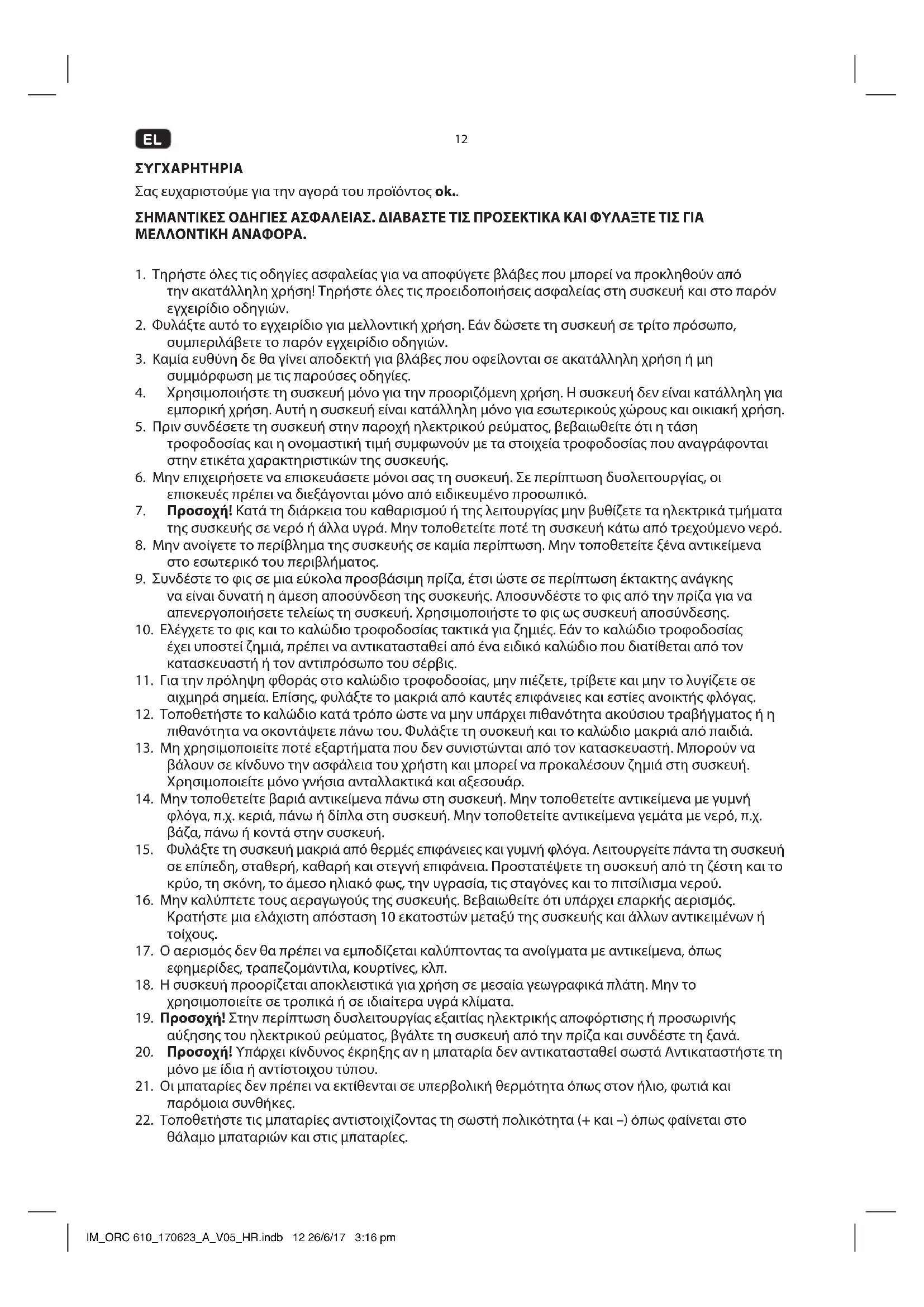 ΣΥΓΧΑΡΗΤΗΡΙΑ Σας ευχαριστούμε για την αγορά του προϊόντος ok.. ΣΗΜΑΝΤΙΚΕΣ ΟΔΗΓΙΕΣ ΑΣΦΑΛΕΙΑΣ. ΔΙΑΒΑΣΤΕ ΤΙΣ ΠΡΟΣΕΚΤΙΚΑ ΚΑΙ ΦΥΛΑΞΤΕ ΤΙΣ ΓΙΑ ΜΕΛΛΟΝΤΙΚΗ ΑΝΑΦΟΡΑ.
