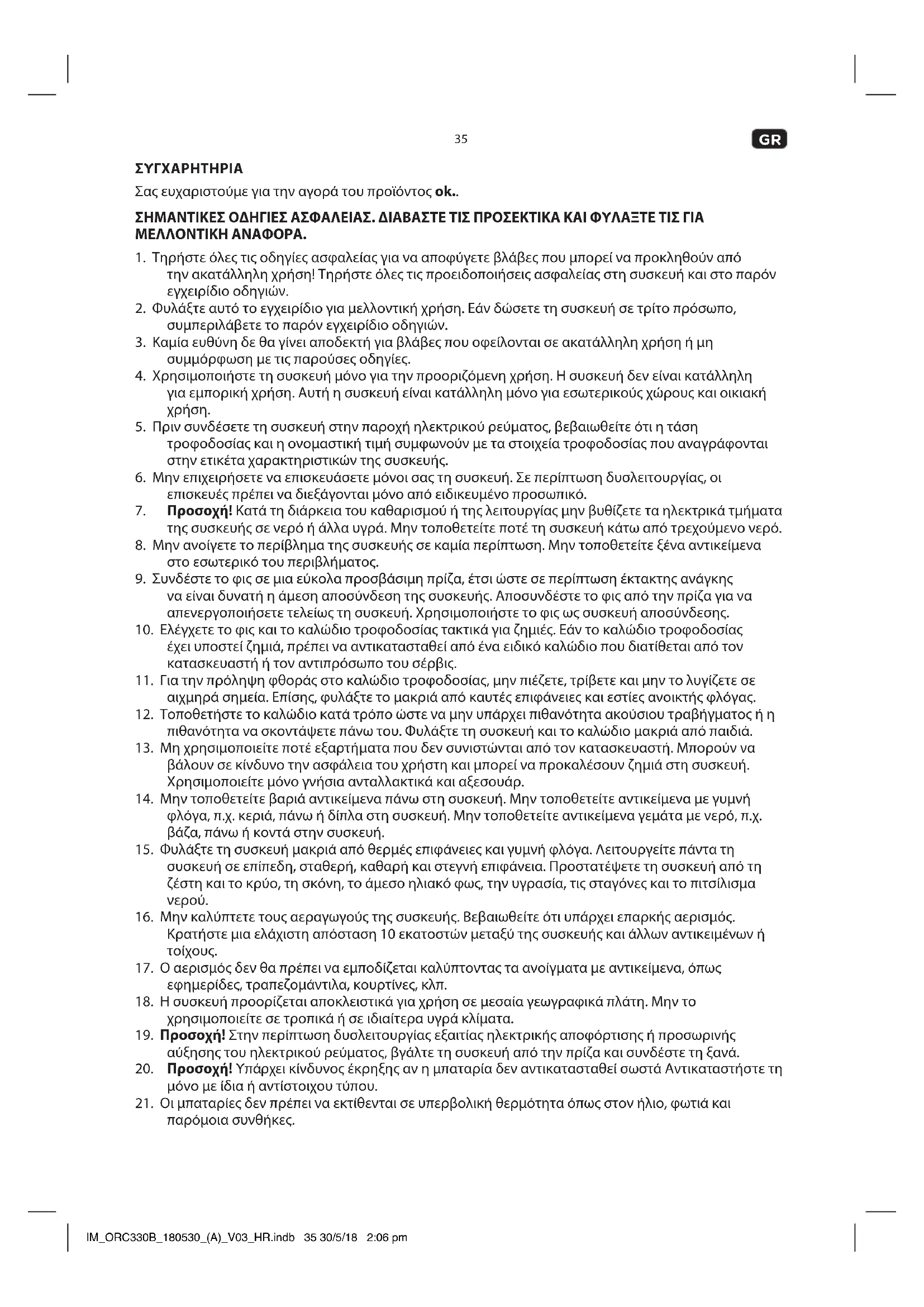 ΣΥΓΧΑΡΗΤΗΡΙΑ Σας ευχαριστούμε για την αγορά του προϊόντος ok.. ΣΗΜΑΝΤΙΚΕΣ ΟΔΗΓΙΕΣ ΑΣΦΑΛΕΙΑΣ. ΔΙΑΒΑΣΤΕ ΤΙΣ ΠΡΟΣΕΚΤΙΚΑ ΚΑΙ ΦΥΛΑΞΤΕ ΤΙΣ ΓΙΑ ΜΕΛΛΟΝΤΙΚΗ ΑΝΑΦΟΡΑ.