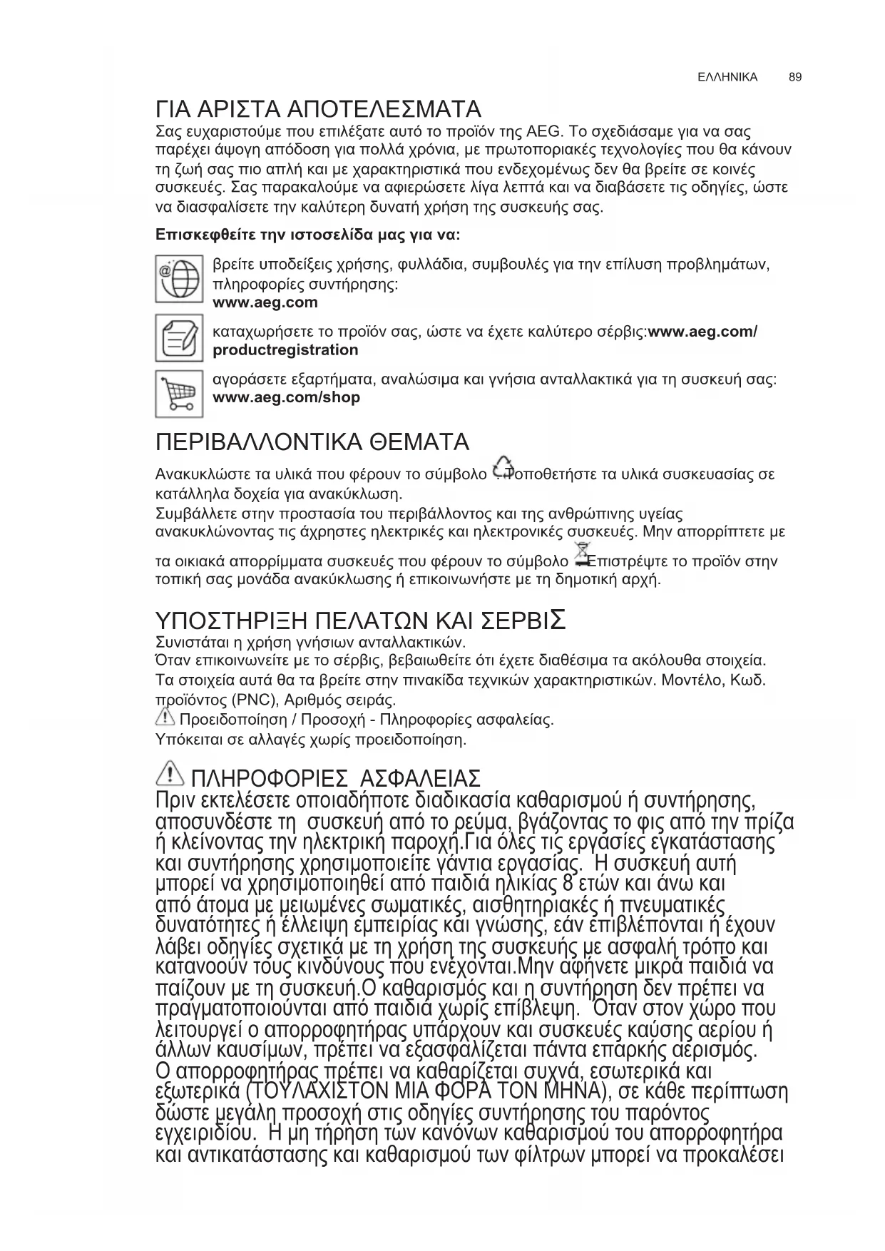 ΓΙΑ ΑΡΙΣΤΑ ΑΠΟΤΕΛΕΣΜΑΤΑ Σας ευχαριστούμε που επιλέξατε αυτό το προϊόν της AEG. Το σχεδιάσαμε για να σας παρέχει άψογη απόδοση για πολλά χρόνια, με πρωτοποριακές τεχνολογίες που θα κάνουν τη ζωή σας πιο απλή και με χαρακτηριστικά που ενδεχομένως δεν θα βρείτε σε κοινές συσκευές. Σας παρακαλούμε να αφιερώσετε λίγα λεπτά και να διαβάσετε τις οδηγίες, ώστε να διασφαλίσετε την καλύτερη δυνατή χρήση της συσκευής σας. Επισκεφθείτε την ιστοσελίδα μας για να: βρείτε υποδείξεις χρήσης, φυλλάδια, συμβουλές για την επίλυση προβλημάτων, πληροφορίες συντήρησης: www.aeg.com καταχωρήσετε το προϊόν σας, ώστε να έχετε καλύτερο σέρβις:www.aeg.com/ productregistration αγοράσετε εξαρτήματα, αναλώσιμα και γνήσια ανταλλακτικά για τη συσκευή σας: www.aeg.com/shop ΠΕΡΙΒΑΛΛΟΝΤΙΚΑ ΘΕΜΑΤΑ Ανακυκλώστε τα υλικά που φέρουν το σύμβολο . Τοποθετήστε τα υλικά συσκευασίας σε κατάλληλα δοχεία για ανακύκλωση. Συμβάλλετε στην προστασία του περιβάλλοντος και της ανθρώπινης υγείας ανακυκλώνοντας τις άχρηστες ηλεκτρικές και ηλεκτρονικές συσκευές. Μην απορρίπτετε με τα οικιακά απορρίμματα συσκευές που φέρουν το σύμβολο . Επιστρέψτε το προϊόν στην τοπική σας μονάδα ανακύκλωσης ή επικοινωνήστε με τη δημοτική αρχή. ΥΠΟΣΤΗΡΙΞΗ ΠΕΛΑΤΩΝ ΚΑΙ ΣΕΡΒΙΣ Συνιστάται η χρήση γνήσιων ανταλλακτικών. Όταν επικοινωνείτε με το σέρβις, βεβαιωθείτε ότι έχετε διαθέσιμα τα ακόλουθα στοιχεία. Τα στοιχεία αυτά θα τα βρείτε στην πινακίδα τεχνικών χαρακτηριστικών. Μοντέλο, Κωδ. προϊόντος (PNC), Αριθμός σειράς. Προειδοποίηση / Προσοχή - Πληροφορίες ασφαλείας. Υπόκειται σε αλλαγές χωρίς προειδοποίηση. ΠΛΗΡΟΦΟΡΙΕΣ ΑΣΦΑΛΕΙΑΣ Πριν εκτελέσετε οποιαδήποτε διαδικασία καθαρισμού ή συντήρησης, αποσυνδέστε τη συσκευή από το ρεύμα, βγάζοντας το φις από την πρίζα ή κλείνοντας την ηλεκτρική παροχή.Για όλες τις εργασίες εγκατάστασης και συντήρησης χρησιμοποιείτε γάντια εργασίας. Η συσκευή αυτή μπορεί να χρησιμοποιηθεί από παιδιά ηλικίας 8 ετών και άνω και από άτομα με μειωμένες σωματικές, αισθητηριακές ή πνευματικές δυνατότητες ή έλλειψη εμπειρίας και γνώσης, εάν επιβλέπονται ή έχουν λάβει οδηγίες σχετικά με τη χρήση της συσκευής με ασφαλή τρόπο και κατανοούν τους κινδύνους που ενέχονται.Μην αφήνετε μικρά παιδιά να παίζουν με τη συσκευή.Ο καθαρισμός και η συντήρηση δεν πρέπει να πραγματοποιούνται από παιδιά χωρίς επίβλεψη. Όταν στον χώρο που λειτουργεί ο απορροφητήρας υπάρχουν και συσκευές καύσης αερίου ή άλλων καυσίμων, πρέπει να εξασφαλίζεται πάντα επαρκής αερισμός. Ο απορροφητήρας πρέπει να καθαρίζεται συχνά, εσωτερικά και εξωτερικά (ΤΟΥΛΑΧΙΣΤΟΝ ΜΙΑ ΦΟΡΑ ΤΟΝ ΜΗΝΑ), σε κάθε περίπτωση δώστε μεγάλη προσοχή στις οδηγίες συντήρησης του παρόντος εγχειριδίου. Η μη τήρηση των κανόνων καθαρισμού του απορροφητήρα και αντικατάστασης και καθαρισμού των φίλτρων μπορεί να προκαλέσει EL ΟΔΗΓΊΕΣ ΧΡΉΣΗΣwww.aeg.com