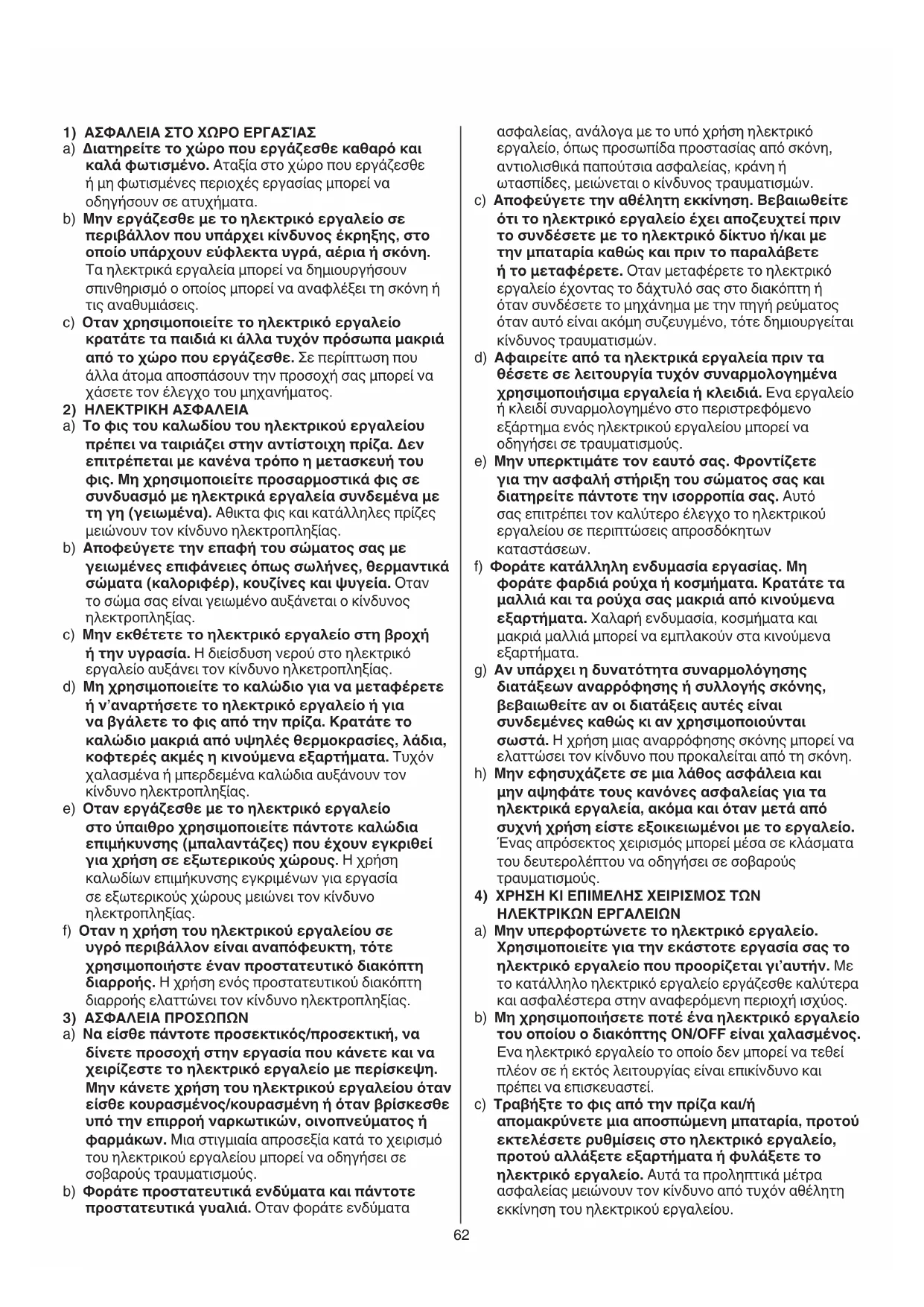 a) Να είσθε πάντοτε προσεκτικός/προσεκτική, να δίνετε προσοχή στην εργασία που κάνετε και να χειρίζεστε το ηλεκτρικό εργαλείο με περίσκεψη. Μην κάνετε χρήση του ηλεκτρικού εργαλείου όταν είσθε κουρασμένος/κουρασμένη ή όταν βρίσκεσθε υπό την επιρροή ναρκωτικών, οινοπνεύματος ή φαρμάκων. Μια στιγμιαία απροσεξία κατά το χειρισμό του ηλεκτρικού εργαλείου μπορεί να οδηγήσει σε σοβαρούς τραυματισμούς. b) Φοράτε προστατευτικά ενδύματα και πάντοτε προστατευτικά γυαλιά. Οταν φοράτε ενδύματα63 άτομα κάτω των 16 ετών