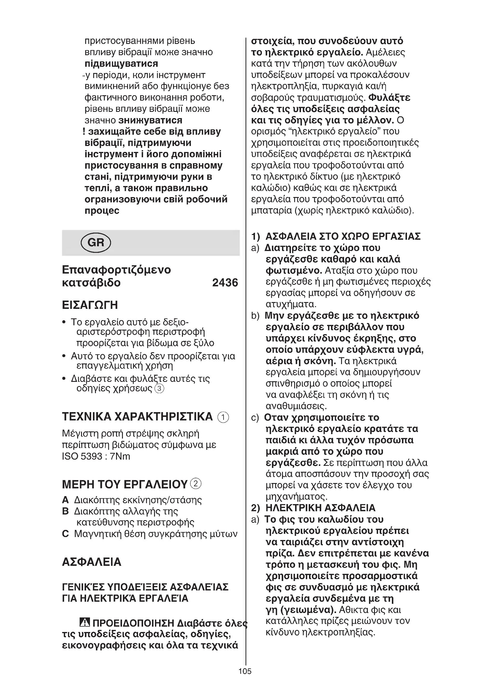ΓΕΝΙΚΈΣ ΥΠΟΔΕΊΞΕΙΣ ΑΣΦΑΛΕΊΑΣ ΓΙΑ ΗΛΕΚΤΡΙΚΆ ΕΡΓΑΛΕΊΑ - ΠΡΟEΙΔΟΠΟΙΗΣΗ Διαβάστε όλες τις υποδείξεις ασφαλείας, οδηγίες, εικονογραφήσεις και όλα τα τεχνικά106 b) Φοράτε προστατευτικά ενδύματα και πάντοτε προστατευτικά γυαλιά. Οταν φοράτε ενδύματα ασφαλείας, ανάλογα με το υπό χρήση ηλεκτρικό εργαλείο, όπως προσωπίδα προστασίας από σκόνη, αντιολισθικά παπούτσια ασφαλείας, κράνη ή ωτασπίδες, μειώνεται ο κίνδυνος τραυματισμών. c) Αποφεύγετε την αθέλητη εκκίνηση. Βεβαιωθείτε ότι το ηλεκτρικό εργαλείο έχει αποζευχτεί πριν το συνδέσετε με το ηλεκτρικό δίκτυο ή/και με την μπαταρία καθώς και πριν το παραλάβετε ή το μεταφέρετε. Οταν μεταφέρετε το ηλεκτρικό εργαλείο έχοντας το δάχτυλό σας στο διακόπτη ή όταν συνδέσετε το μηχάνημα με την πηγή ρεύματος όταν αυτό είναι ακόμη συζευγμένο, τότε δημιουργείται κίνδυνος τραυματισμών. d) Αφαιρείτε από τα ηλεκτρικά εργαλεία πριν τα θέσετε σε λειτουργία τυχόν συναρμολογημένα χρησιμοποιήσιμα εργαλεία ή κλειδιά. Eνα εργαλείο ή κλειδί συναρμολογημένο στο περιστρεφόμενο εξάρτημα ενός ηλεκτρικού εργαλείου μπορεί να οδηγήσει σε τραυματισμούς. e) Μην υπερκτιμάτε τον εαυτό σας. Φροντίζετε για την ασφαλή στήριξη του σώματος σας και διατηρείτε πάντοτε την ισορροπία σας. Αυτό σας επιτρέπει τον καλύτερο έλεγχο το ηλεκτρικού εργαλείου σε περιπτώσεις απροσδόκητων καταστάσεων. f) Φοράτε κατάλληλη ενδυμασία εργασίας. Μη φοράτε φαρδιά ρούχα ή κοσμήματα. Κρατάτε τα μαλλιά και τα ρούχα σας μακριά από κινούμενα εξαρτήματα. Xαλαρή ενδυμασία, κοσμήματα και μακριά μαλλιά μπορεί να εμπλακούν στα κινούμενα εξαρτήματα. g) Αν υπάρχει η δυνατότητα συναρμολόγησης διατάξεων αναρρόφησης ή συλλογής σκόνης, βεβαιωθείτε αν οι διατάξεις αυτές είναι συνδεμένες καθώς κι αν χρησιμοποιούνται b) Αποφεύγετε την επαφή του σώματος σας με γειωμένες επιφάνειες όπως σωλήνες, θερμαντικά σώματα (καλοριφέρ), κουζίνες και ψυγεία. Οταν το σώμα σας είναι γειωμένο αυξάνεται ο κίνδυνος ηλεκτροπληξίας. c) Μην εκθέτετε το ηλεκτρικό εργαλείο στη βροχή ή την υγρασία. Η διείσδυση νερού στο ηλεκτρικό εργαλείο αυξάνει τον κίνδυνο ηλκετροπληξίας. d) Μη χρησιμοποιείτε το καλώδιο για να μεταφέρετε ή ν’αναρτήσετε το ηλεκτρικό εργαλείο ή για να βγάλετε το φις από την πρίζα. Κρατάτε το καλώδιο μακριά από υψηλές θερμοκρασίες, λάδια, κοφτερές ακμές η κινούμενα εξαρτήματα. Τυχόν χαλασμένα ή μπερδεμένα καλώδια αυξάνουν τον κίνδυνο ηλεκτροπληξίας. e) Οταν εργάζεσθε με το ηλεκτρικό εργαλείο στο ύπαιθρο χρησιμοποιείτε πάντοτε καλώδια επιμήκυνσης (μπαλαντάζες) που έχουν εγκριθεί για χρήση σε εξωτερικούς χώρους. Η χρήση καλωδίων επιμήκυνσης εγκριμένων για εργασία σε εξωτερικούς χώρους μειώνει τον κίνδυνο ηλεκτροπληξίας. f) Οταν η χρήση του ηλεκτρικού εργαλείου σε υγρό περιβάλλον είναι αναπόφευκτη, τότε χρησιμοποιήστε έναν προστατευτικό διακόπτη διαρροής. Η χρήση ενός προστατευτικού διακόπτη διαρροής ελαττώνει τον κίνδυνο ηλεκτροπληξίας.