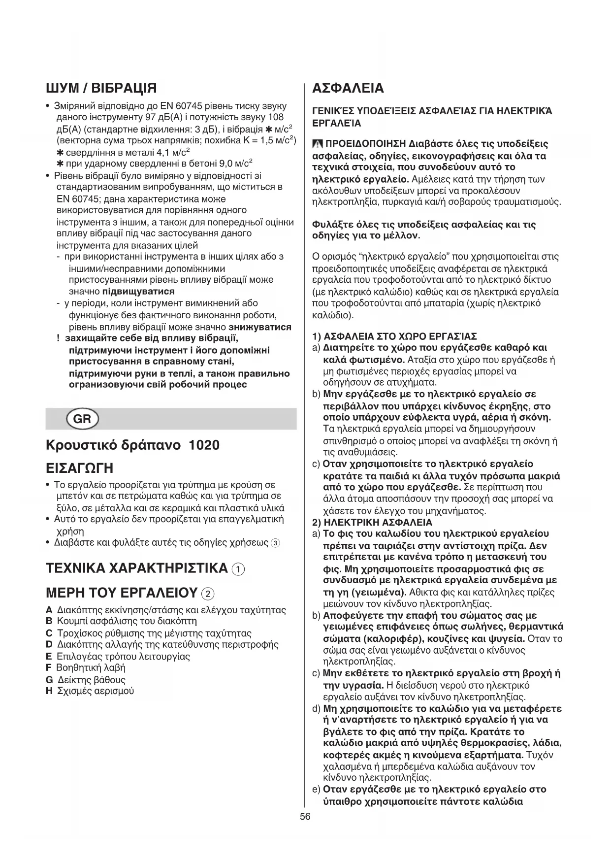 ΜΕΡΗ ΤΟY ΕΡΓΑΛΕΙΟY 2 A Διακόπτης εκκίνησης/στάσης και ελέγχου ταχύτητας B Κουμπί ασφάλισης του διακόπτη C Tροχίσκoς ρύθμισης της μέγιστης ταχύτητας D Διακόπτης αλλαγής της κατεύθυνσης περιστροφής E Επιλογέας τρόπου λειτουργίας F Βοηθητική λαβή G Δείκτης βάθους H Σχισμές αερισμού