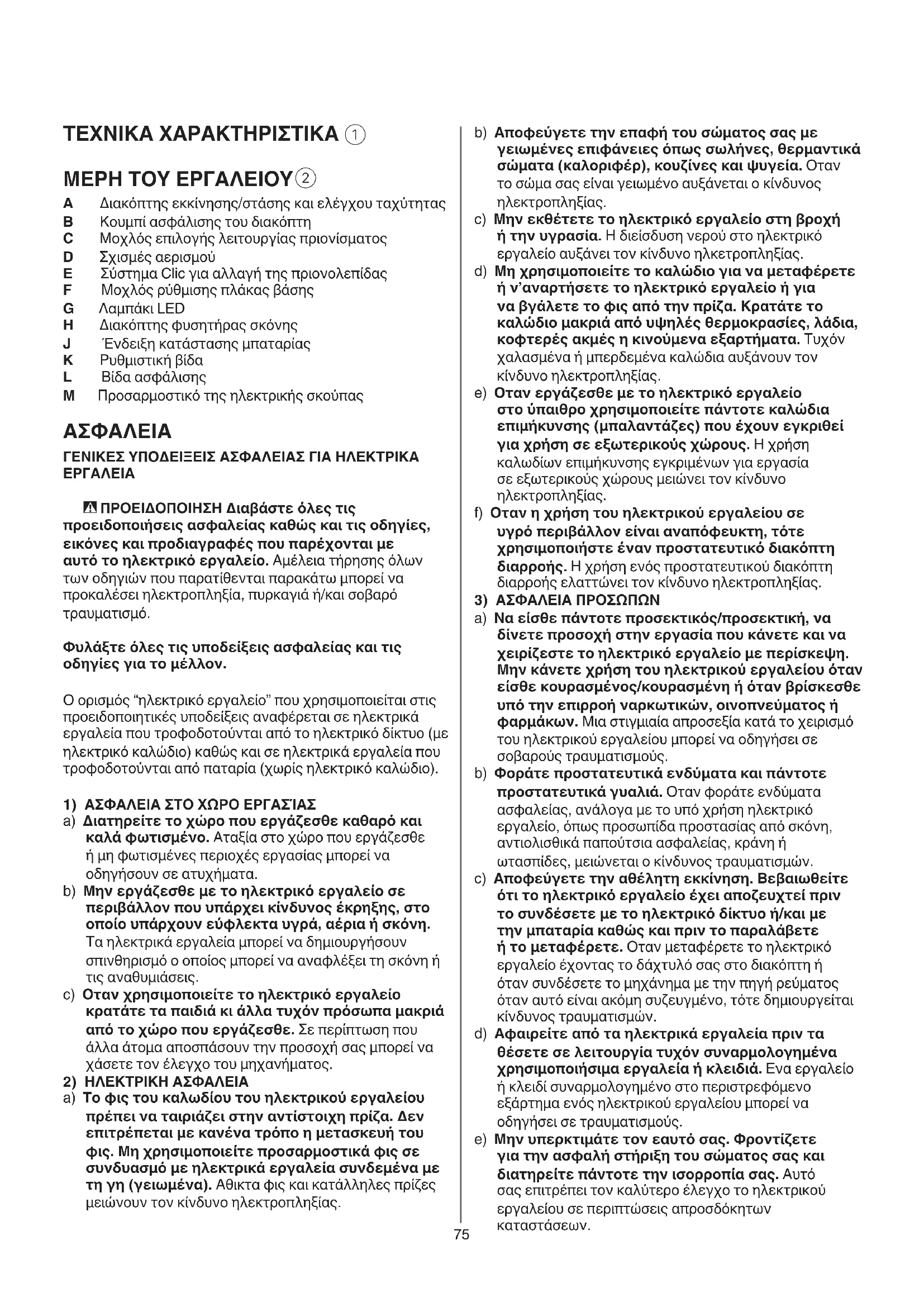 a) Μην υπερφορτώνετε το ηλεκτρικό εργαλείο. Xρησιμοποιείτε για την εκάστοτε εργασία σας το ηλεκτρικό εργαλείο που προορίζεται γι’αυτήν. Με το κατάλληλο ηλεκτρικό εργαλείο εργάζεσθε καλύτερα και ασφαλέστερα στην αναφερόμενη περιοχή ισχύος. b) Μη χρησιμοποιήσετε ποτέ ένα ηλεκτρικό εργαλείο του οποίου ο διακόπτης ON/OFF είναι χαλασμένος. Eνα ηλεκτρικό εργαλείο το οποίο δεν μπορεί να τεθεί πλέον σε ή εκτός λειτουργίας είναι επικίνδυνο και πρέπει να επισκευαστεί. c) Τραβήξτε το φις από την πρίζα και/ή απομακρύνετε μια αποσπώμενη μπαταρία, προτού εκτελέσετε ρυθμίσεις στο ηλεκτρικό εργαλείο, προτού αλλάξετε εξαρτήματα ή φυλάξετε το ηλεκτρικό εργαλείο. Αυτά τα προληπτικά μέτρα ασφαλείας μειώνουν τον κίνδυνο από τυχόν αθέλητη εκκίνηση του ηλεκτρικού εργαλείου. d) Διαφυλάγετε τα ηλεκτρικά εργαλεία που δε χρησιμοποιείτε μακριά από παιδιά. Μην αφήνετε άτομα που δεν είναι εξοικειωμένα με το ηλεκτρικό εργαλείο ή δεν έχουν διαβάσει αυτές τις οδηγίες χρήσης να το χρησιμοποιήσουν. Τα ηλεκτρικά εργαλεία είναι επικίνδυνα όταν χρησιμοποιούνται από άπειρα πρόσωπα. e) Φροντίζετε τα ηλεκτρικά εργαλεία και τα εξάρτημα με επιμέλεια. Ελέγχετε, αν τα κινούμενα εξαρτήματα λειτουργούν άψογα, χωρίς να μπλοκάρουν, ή μήπως έχουν σπάσει ή φθαρεί τυχόν εξαρτήματα τα οποία επηρεάζουν τον τρόπο λειτουργίας του ηλεκτρικού εργαλείου. Δώστε αυτά τα χαλασμένα εξαρτήματα για επισκευή πριν τα ξαναχρησιμοποιήσετε. Η κακή συντήρηση των ηλεκτρικών εργαλείων αποτελεί αιτία πολλών ατυχημάτων. f) Διατηρείτε τα κοπτικά εργαλεία κοφτερά και καθαρά. Τα κοπτικά εργαλεία που συντηρούνται με προσοχή μπορούν να οδηγηθούν εύκολα και να ελεγχθούν καλύτερα. g) Xρησιμοποιείτε τα ηλεκτρικά εργαλεία, τα εξαρτήματα, τα χρησιμοποιήσιμα εργαλεία κτλ. σύμφωνα με τις παρούσες οδηγίες καθώς. Λαμβάνετε ταυτόχρονα υπόψην σας τις συνθήκες77
