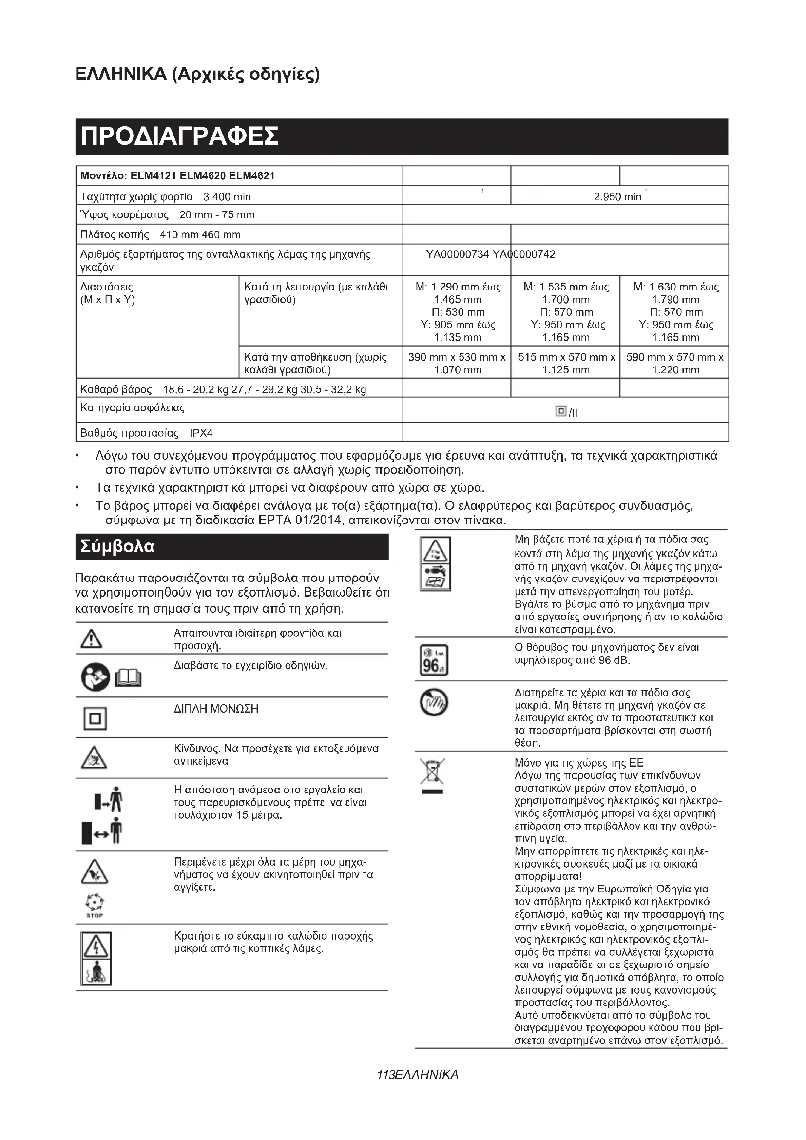 Μηναπορρίπτετετιςηλεκτρικέςκαιηλε- κτρονικέςσυσκευέςμαζίμεταοικιακά απορρίμματα! ΣύμφωναμετηνΕυρωπαϊκήΟδηγίαγια τοναπόβλητοηλεκτρικόκαιηλεκτρονικό εξοπλισμό,καθώςκαιτηνπροσαρμογήτης στηνεθνικήνομοθεσία,οχρησιμοποιημέ- νοςηλεκτρικόςκαιηλεκτρονικόςεξοπλι- σμόςθαπρέπεινασυλλέγεταιξεχωριστά καιναπαραδίδεταισεξεχωριστόσημείο συλλογήςγιαδημοτικάαπόβλητα,τοοποίο λειτουργείσύμφωναμετουςκανονισμούς προστασίαςτουπεριβάλλοντος. Αυτόυποδεικνύεταιαπότοσύμβολοτου διαγραμμένουτροχοφόρουκάδουπουβρί- σκεταιαναρτημένοεπάνωστονεξοπλισμό.114 ΕΛΛΗΝΙΚΑ Προοριζόμενη χρήση Τομηχάνημαπροορίζεταιγιατοκούρεμαγκαζόν.Μη χρησιμοποιείτετομηχάνημαγιαάλλουςσκοπούς.Αν χρησιμοποιείτετομηχάνημαγιαεργασίεςδιαφορετικές απότηνενδεδειγμένηχρήση,μπορείναέχειωςαποτέ- λεσμαμιαεπικίνδυνηκατάσταση. Ηλεκτρική παροχή Τοεργαλείοπρέπεινασυνδέεταιμόνομεηλεκτρική παροχήτηςίδιαςτάσηςμεαυτήπουαναγράφεταιστην πινακίδαονομαστικώντιμώνκαιμπορείναλειτουργήσει μόνομεεναλλασσόμενομονοφασικόρεύμα.Υπάρχει διπλήμόνωσηκαικατάσυνέπεια,μπορείναγίνεισύν- δεσησεακροδέκτεςχωρίςσύρμαγείωσης. Αντοηλεκτρικόκαλώδιοείναικατεστραμμένο,πρέπει νααντικατασταθείαπότονκατασκευαστήήτονεκπρό- σωποεπισκευώντουπροκειμένουνααποφευχθεί τυχόνκίνδυνος. Για δημόσια συστήματα διανομής ηλεκτρικού ρεύματος χαμηλής τάσης μεταξύ 220 V και 250 V Ηενεργοποίησηκαιαπενεργοποίησητηςηλεκτρικής συσκευήςπροκαλείδιακυμάνσειςτάσης.Ηλειτουργία αυτήςτηςσυσκευήςκάτωαπόάσχημεςσυνθήκες παροχήςηλεκτρικούρεύματοςμπορείναέχειδυσμενή αποτελέσματαστηλειτουργίαάλλουεξοπλισμού.Όταν ηαντίστασηκεντρικούηλεκτρικούρεύματοςείναιίση μεήμικρότερηαπό0,422Ω(γιαELM4121),μπορείνα θεωρηθείότιδενθαυπάρχουναρνητικέςεπιδράσεις. Ηυποδοχήπαροχήςρεύματοςγιατησυσκευήαυτή πρέπειναπροστατεύεταιαπόμιαασφάλειαήέναπρο- στατευτικόκύκλωμαδιακόπτηπουναέχειαργάχαρα- κτηριστικάαποσύνδεσης.