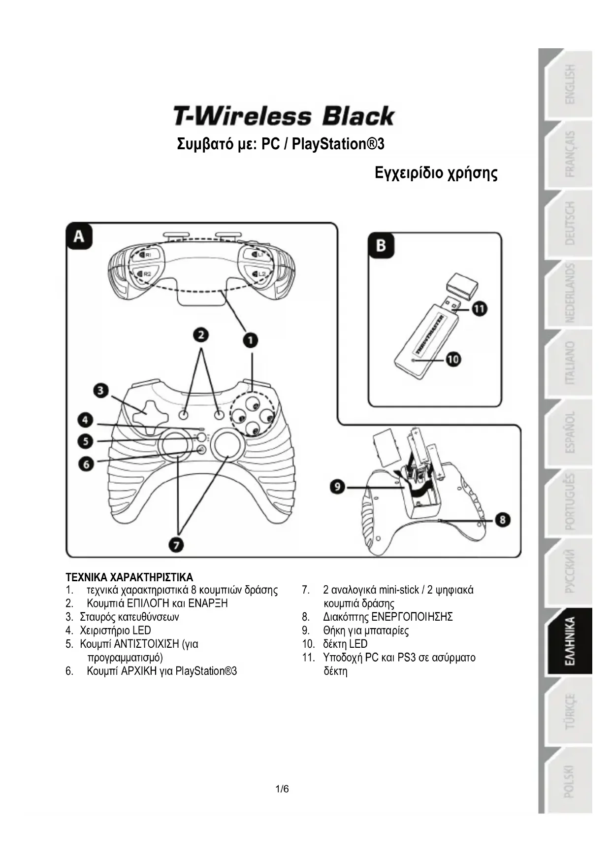 2 Αφήστε το κουμπί ΑΝΤΙΣΤΟΙΧΙΣΗ (5) ΠΡΑΣΙΝΟ Τώρα ο προγραμματισμός σας έχει σβηστεί. Έχετε υπόψη ότι ο προγραμματισμός σας επίσης εξαφανίζεται κάθε φορά που το χειριστήριο αποσυνδέεται ή όποτε το χειριστήριο (ή η κονσόλα) βρίσκονται σε κατάσταση αναμονής ή πραγματοποιούν επανεκκίνηση. ΑΝΤΙΜΕΤΩΠΙΣΗ ΠΡΟΒΛΗΜΑΤΩΝ ΚΑΙ ΠΡΟΕΙΔΟΠΟΙΗΣΕΙΣ Το χειριστήριό μου δεν λειτουργεί σωστά ή φαίνεται να έχει βαθμονομηθεί λανθασμένα: - Στην περίπτωση κακής λειτουργίας λόγω ηλεκτροστατικής εκκένωσης, εξέλθετε από το παιχνίδι, απενεργοποιήστε το χειριστήριό σας και αποσυνδέστε τον δέκτη από την κονσόλα ή το PC σας. Συνεχίστε κανονικά το παιχνίδι συνδέοντας ξανά τον δέκτη, και στη συνέχεια, ενεργοποιήστε το χειριστήριο και αρχίστε ξανά το παιχνίδι. - Ποτέ μην μετακινείτε τα mini-stick όταν συνδέετε το χειριστήριό σας (για να αποτρέψετε οποιαδήποτε προβλήματα βαθμονόμησης). Δεν μπορώ να διαμορφώσω το χειριστήριό μου: - Στο μενού "Επιλογές / Ελεγκτής / Χειριστήριο" στο παιχνίδι σας: επιλέξτε την πιο κατάλληλη διαμόρφωση. - Για περισσότερες πληροφορίες, δείτε στο εγχειρίδιο χρήσης του παιχνιδιού σας ή στην online βοήθεια. - Μπορείτε επίσης να χρησιμοποιήσετε τη λειτουργία "προγραμματισμός" του παιχνιδιού σας για να επιλύσετε αυτόν τον τύπο προβλήματος. Όταν σταματήσετε να χρησιμοποιείτε το χειριστήριό σας, συνιστούμε να ρυθμίζετε πάντα τον διακόπτη ΕΝΕΡΓΟΠΟΙΗΣΗ του χειριστηρίου σας (9) στη θέση ΑΠΕΝΕΡΓΟΠΟΙΗΣΗ (για επέκταση της διάρκειας ζωής της μπαταρίας).4/6 Πληροφορίες εγγύησης καταναλωτή Παγκοσμίως, η Guillemot Corporation S.A. της οποίας η εγγεγραμμένη έδρα είναι η οδός Place du Granier, B.P. 97143, 35571 Chantepie, France (Γαλλία) (εφεξής “Guillemot”) εγγυάται στον καταναλωτή ότι το προϊόν της Thrustmaster δεν παρουσιάζει ελάττωμα στο υλικό ούτε κατασκευαστικές ατέλειες για το χρονικό διάστημα της εγγύησης, το οποίο αντιστοιχεί στο χρονικό όριο για άσκηση αγωγής για συμμόρφωση αναφορικά με αυτό το προϊόν. Στις χώρες της Ε.Ε., αυτό αντιστοιχεί σε διάστημα δύο (2) ετών από την παράδοση του προϊόντος της Thrustmaster. Σε άλλες χώρες, η περίοδος εγγύησης αντιστοιχεί στο χρονικό όριο για άσκηση αγωγής για συμμόρφωση αναφορικά το προϊόν της Thrustmaster σύμφωνα με την ισχύουσα νομοθεσία της χώρας στην οποία ο καταναλωτής διέμενε κατά την ημερομηνία αγοράς του προϊόντος της Thrustmaster (σε περίπτωση που δεν υπάρχει τέτοια ενέργεια στην αντίστοιχη χώρα, τότε η εγγύηση θα ισχύει για ένα (1) έτος από την αρχική ημερομηνία αγοράς του προϊόντος της Thrustmaster). Σε περίπτωση που το προϊόν σας φαίνεται να είναι ελαττωματικό κατά την περίοδο της εγγύησης, επικοινωνήστε αμέσως με την Τεχνική υποστήριξη, η οποία θα υποδείξει την διαδικασία που θα ακολουθήσετε. Αν το ελάττωμα επιβεβαιωθεί, το προϊόν πρέπει να επιστραφεί στο σημείο αγοράς του (ή σε οποιοδήποτε άλλο σημείο υποδεικνύει η Τεχνική υποστήριξη). Στα πλαίσια της εγγύησης, το ελαττωματικό προϊόν του καταναλωτή, με επιλογή της Τεχνικής υποστήριξης, είτε θα αντικατασταθεί είτε θα επιστραφεί και θα είναι σε κατάσταση λειτουργίας. Αν κατά τη διάρκεια της περιόδου εγγύησης το προϊόν της Thrustmaster υπόκειται σε τέτοιου είδους μετασκευή, οποιαδήποτε περίοδος τουλάχιστον επτά (7) ημερών κατά την οποία το προϊόν έχει τεθεί εκτός χρήσης θα προστεθεί στην εναπομένουσα περίοδο εγγύησης (αυτή η περίοδος ισχύει από την ημερομηνία του αιτήματος του καταναλωτή για παρέμβαση ή από την ημερομηνία κατά τ