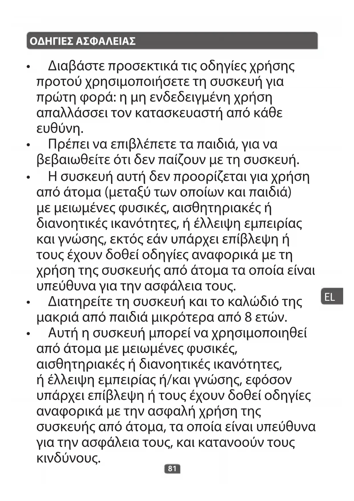- Η συσκευή αυτή δεν προορίζεται για χρήση από άτομα (μεταξύ των οποίων και παιδιά) με μειωμένες φυσικές, αισθητηριακές ή διανοητικές ικανότητες, ή έλλειψη εμπειρίας και γνώσης, εκτός εάν υπάρχει επίβλεψη ή τους έχουν δοθεί οδηγίες αναφορικά με τη χρήση της συσκευής από άτομα τα οποία είναι υπεύθυνα για την ασφάλεια τους.
