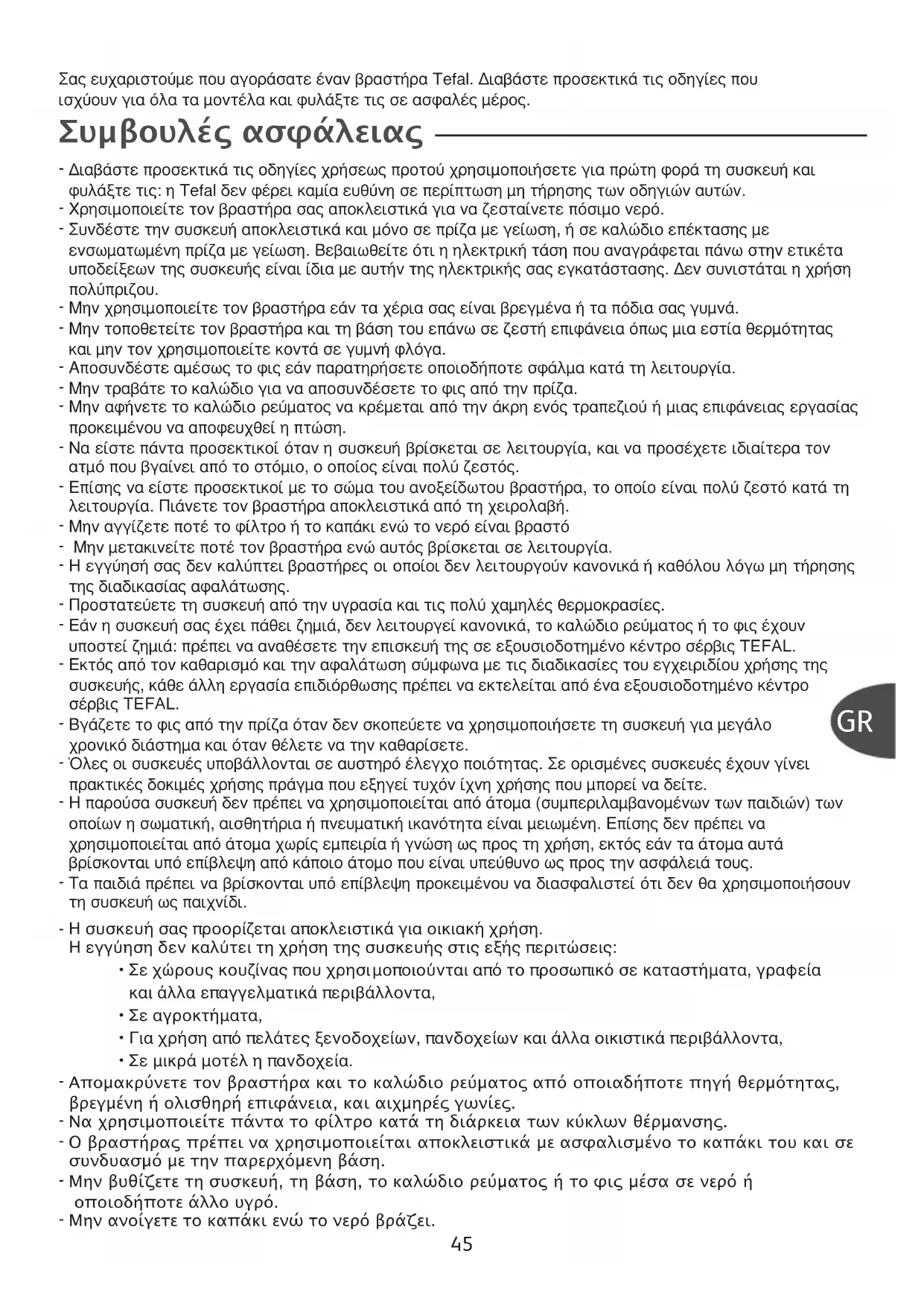 Συµβουλές ασφάλειας ™·˜ ¢¯·ÚÈÛÙԇ̠Ԣ ·ÁÔÚ¿Û·Ù ¤Ó·Ó ‚Ú·ÛÙ‹Ú· Tefal. ¢È·‚¿ÛÙ ÚÔÛÂÎÙÈο ÙȘ Ô‰ËÁ›Â˜ Ô˘ ÈÛ¯‡Ô˘Ó ÁÈ· fiÏ· Ù· ÌÔÓ٤Ϸ Î·È Ê˘Ï¿ÍÙ ÙȘ Û ·ÛʷϤ˜ ̤ÚÔ˜. GR46 - Εάν το καλώδιο ρεύματος ή το φις υποστούν ζημιά, μη χρησιμοποιήσετε άλλο τη συσκευή. Προκειμένου να αποφύγετε κάθε κίνδυνο, θα πρέπει οπωσδήποτε να ζητήσετε να σας αντικαταστήσουν το εξάρτημα που έχει υποστεί ζημιά σε ένα εξουσιοδοτημένο κέντρο σέρβις της TEFAL. - Η εγγύηση καλύπτει αποκλειστικά και μόνο σφάλματα κατασκευής και οικιακής χρήσης. Κάθε βλάβη που έχει προκληθεί λόγω μη τήρησης των οδηγιών χρήσης δεν καλύπτονται από το πλαίσιο της εγγύησης. - Μην χρησιμοποιείτε συρμάτινα σφουγγαράκια για τον καθαρισμό. - Για να αφαιρέσετε το φίλτρο κατά των αλάτων, βγάλτε τον βραστήρα από τη βάση του και αφήνετε τη συσκευή να κρυώσει. Ποτέ μην αφαιρείτε το φίλτρο ενώ η συσκευή είναι γεμάτη με ζεστό νερό. - Να χρησιμοποιείτε αποκλειστικά τη συνιστώμενη μέθοδος αφαλάτωσης. - Μην γεμίζετε τον βραστήρα με νερό πάνω από τη μέγιστη στάθμη του βραστήρα, ούτε και κάτω από την ελάχιστη στάθμη.