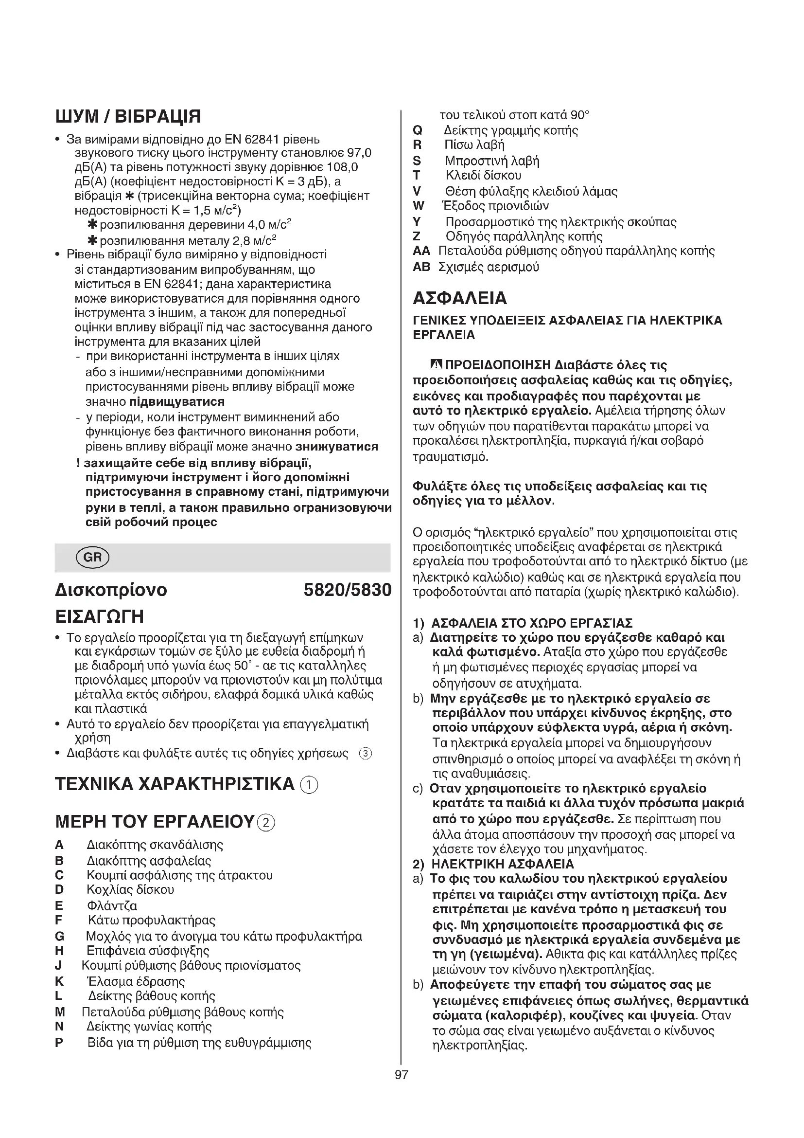 a) To φις του καλωδίου του ηλεκτρικού εργαλείου πρέπει να ταιριάζει στην αντίστοιχη πρίζα. Δεν επιτρέπεται με κανένα τρόπο η μετασκευή του φις. Μη χρησιμοποιείτε προσαρμοστικά φις σε συνδυασμό με ηλεκτρικά εργαλεία συνδεμένα με τη γη (γειωμένα). Αθικτα φις και κατάλληλες πρίζες μειώνουν τον κίνδυνο ηλεκτροπληξίας. b) Αποφεύγετε την επαφή του σώματος σας με γειωμένες επιφάνειες όπως σωλήνες, θερμαντικά σώματα (καλοριφέρ), κουζίνες και ψυγεία. Οταν το σώμα σας είναι γειωμένο αυξάνεται ο κίνδυνος ηλεκτροπληξίας. ШУМ / ВІБРАЦІЯ