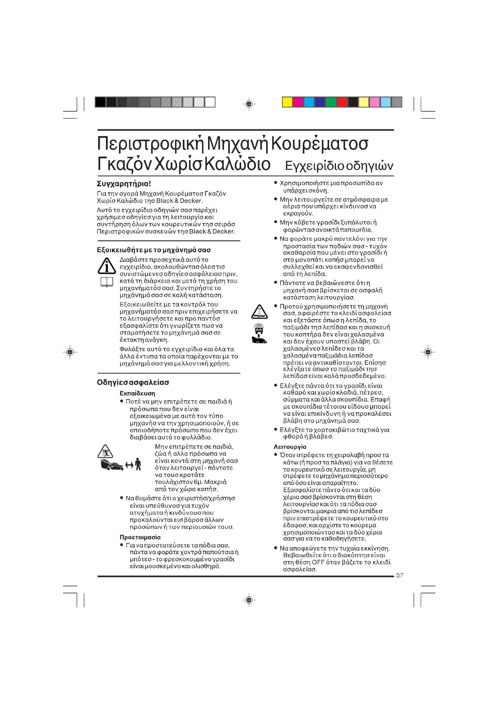 (com garantia) dB(A) 96 Valor médio quadrático ponderado em frequência de aceleração conforme à EN 50144: Brian Cooke Engenheiro Responsável Spennymoor, County Durham DL16 6JG, United Kingdom 1-12-200157 Περιστροφική Μηχανή Κουρέµατοσ Γκαζν Χωρίσ Καλώδιο Eγχειρίδιο οδηγιών Συγχαρητήρια! Για την αγορά Μηχανή Κουρέµατοσ Γκαζν Χωρίσ Καλώδιο τησ Black & Decker. Αυτ το εγχειρίδιο οδηγιών σασ παρέχει χρήσιµεσ οδηγίεσ για τη λειτουργία και συντήρηση λων των κουρευτικών τησ σειράσ Περιστροφικών συσκευών τησ Black & Decker. Εξοικειωθήτε µε το µηχάνηµά σασ ∆ιαβάστε προσεχτικά αυτ το εγχειρίδιο, ακολουθώντασ λεσ τισ συνιστώµενεσ οδηγίεσ ασφάλειασ πριν, κατά τη διάρκεια και µετά τη χρήση του µηχανήµατσ σασ. Συντηρήστε το µηχάνηµά σασ σε καλή κατάσταση. Εξοικειωθείτε µε τα κοντρλ του µηχανήµατσ σασ πριν επιχειρήσετε να το λειτουργήσετε και προ παντσ εξασφαλίστε τι γνωρίζετε πωσ να σταµατήσετε το µηχάνηµά σασ σε έκτακτη ανάγκη. Φυλάξτε αυτ το εγχειρίδιο και λα τα άλλα έντυπα τα οποία παρέχονται µε το µηχάνηµά σασ για µελλοντική χρήση. Oδηγίεσ ασφαλείασ Eκπαίδευση