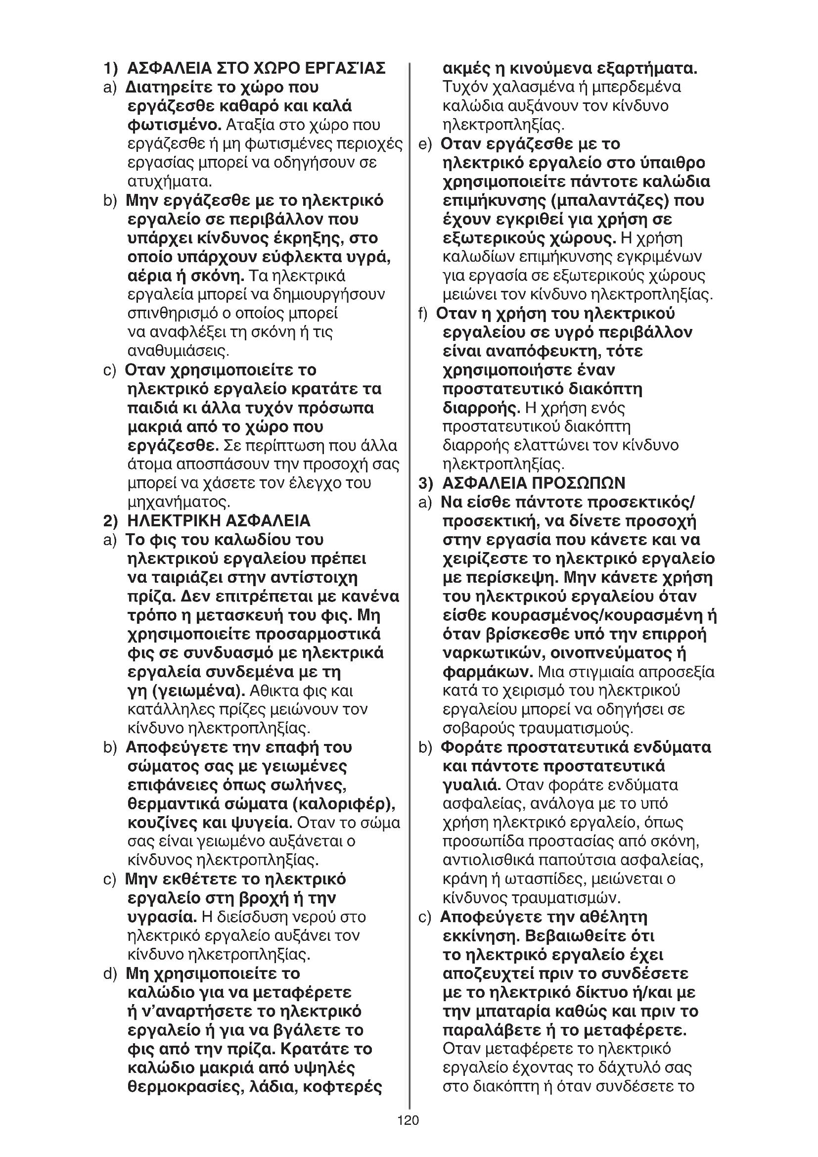 b) Μην εργάζεσθε με το ηλεκτρικό εργαλείο σε περιβάλλον που υπάρχει κίνδυνος έκρηξης, στο οποίο υπάρχουν εύφλεκτα υγρά, αέρια ή σκόνη. Τα ηλεκτρικά εργαλεία μπορεί να δημιουργήσουν σπινθηρισμό ο οποίος μπορεί να αναφλέξει τη σκόνη ή τις αναθυμιάσεις. c) Οταν χρησιμοποιείτε το ηλεκτρικό εργαλείο κρατάτε τα παιδιά κι άλλα τυχόν πρόσωπα μακριά από το χώρο που εργάζεσθε. Σε περίπτωση που άλλα άτομα αποσπάσουν την προσοχή σας μπορεί να χάσετε τον έλεγχο του μηχανήματος.