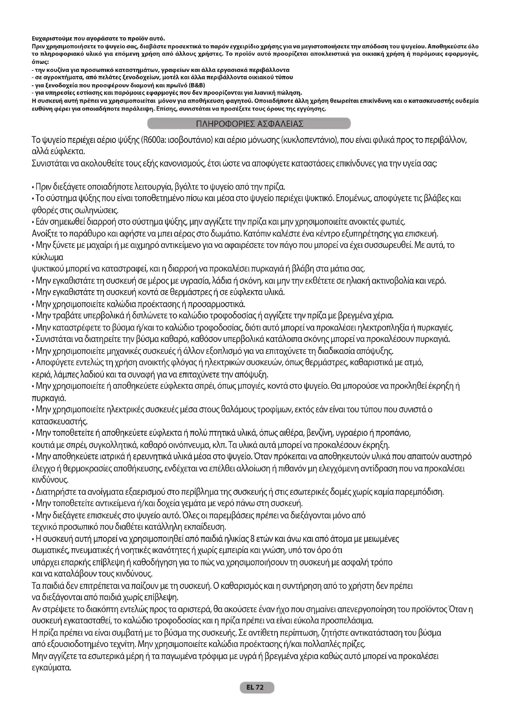 - Vergewis u ervan dat er stroom is in de woning. ALS U HET PROBLEEM NIET HEBT OPGELOST, NEEM CONTACT OP MET HET SERVICECENTRUM. VERMELD DE AARD VAN DE STORING EN DE INFORMATIE OP HET TYPEPLAATJE BINNENIN HET KOELGEDEELTE:EL ΠΕΡΙΕΧΟΜΕΝΑ EL 71 ΠΛΗΡΟΦΟΡΙΕΣ ΑΣΦΑΛΕΙΑΣ........................................................ 72--72 ΕΓΚΑΤΑΣΤΑΣΗ .............................................................................. 73--73 ΛΕΙΤΟΥΡΓΙΑ .................................................................................. 73--73 ΔΙΑΤΗΡΗΣΗ .................................................................................. 74--74 ΚΑΤΑΨΥΞΗ.................................................................................... 75--75 ΑΠΟΨΥΞΗ...................................................................................... 75--75 ΣΥΝΤΗΡΗΣΗ ΚΑΙ ΚΑΘΑΡΙΣΜΟΣ .................................................. 76--76 ΕΞΟΙΚΟΝΟΜΗΣΗ ΕΝΕΡΓΕΙΑΣ ...................................................... 76--76 ΑΘΟΡΥΒΗ ΛΕΙΤΟΥΡΓΙΑ ................................................................ 76--76 ΑΝΤΙΣΤΡΟΦΗ ΤΗΣ ΠΟΡΤΑΣ ........................................................ 76--77 ΔΙΑΣΤΑΣΕΙΣ ΠΡΟΪΟΝΤΟΣ ΚΑΙ ΕΝΣΩΜΑΤΩΜΕΝΟΣ ΘΑΛΑΜΟΣ .................................................................................... 77--78 ΤΟΠΟΘΕΤΗΣΗ ΤΗΣ ΣΥΣΚΕΥΗΣ ΣΤΗ ΣΤΗΛΗ ΕΓΚΑ ΤΑΣΤΑΣΗΣ .................................................................................... 78--78 ΕΝΩΣΗ ΤΩΝ ΘΥΡΩΝ ΤΟΥ ΨΥΓΕΙΟΥ ΜΕ ΤΙΣ ΠΟΡΤΕΣ ΤΟΥ ΕΠΙΠΛΟΥ .......................................................... 79--79 ΠΡΟΦΥΛΑΞΕΙΣ ΓΙΑ ΤΗ ΣΩΣΤΗ ΛΕΙΤΟΥΡΓΙΑ................................ 79--79 ΠΑΡΑΤΕΤΑΜΕΝΗ ΑΝΑΣΤΟΛΗ ΛΕΙΤΟΥΡΓΙΑΣ.............................. 79--79 ΑΝΤΙΜΕΤΩΠΙΣΗ ΠΡΟΒΛΗΜΑΤΩΝ .............................................. 80--80EL 72 Ευχαριστούμε που αγοράσατε το προϊόν αυτό. Πριν χρησιμοποιήσετε το ψυγείο σας, διαβάστε προσεκτικά το παρόν εγχειρίδιο χρήσης για να μεγιστοποιήσετε την απόδοση του ψυγείου. Αποθηκεύστε όλο το πληροφοριακό υλικό για επόμενη χρήση από άλλους χρήστες. Το προϊόν αυτό προορίζεται αποκλειστικά για οικιακή χρήση ή παρόμοιες εφαρμογές,