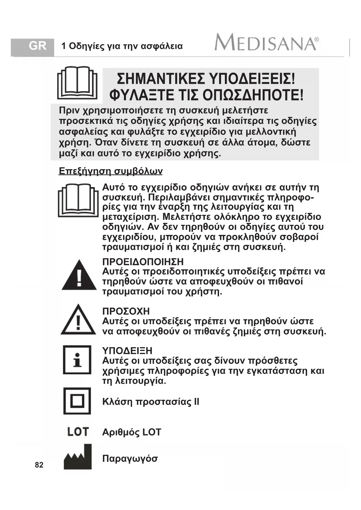 Πριν χρησιμοποιήσετε τη συσκευή μελετήστε προσεκτικά τις οδηγίες χρήσης και ιδιαίτερα τις οδηγίες ασφαλείας και φυλάξτε το εγχειρίδιο για μελλοντική χρήση. Όταν δίνετε τη συσκευή σε άλλα άτομα, δώστε μαζί και αυτό το εγχειρίδιο χρήσης. Κλάση προστασίας IIGR 1 Οδηγίες για την ασφάλεια